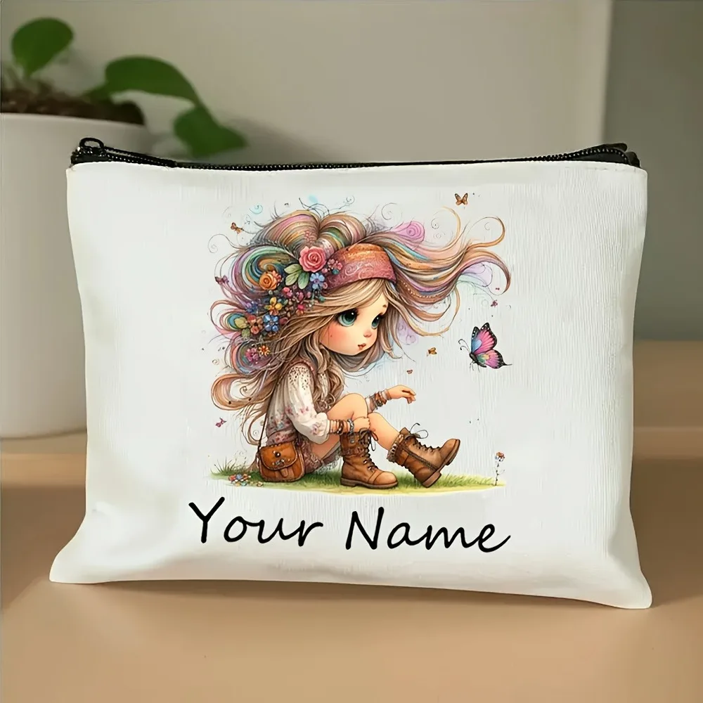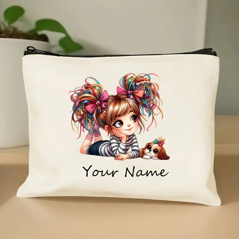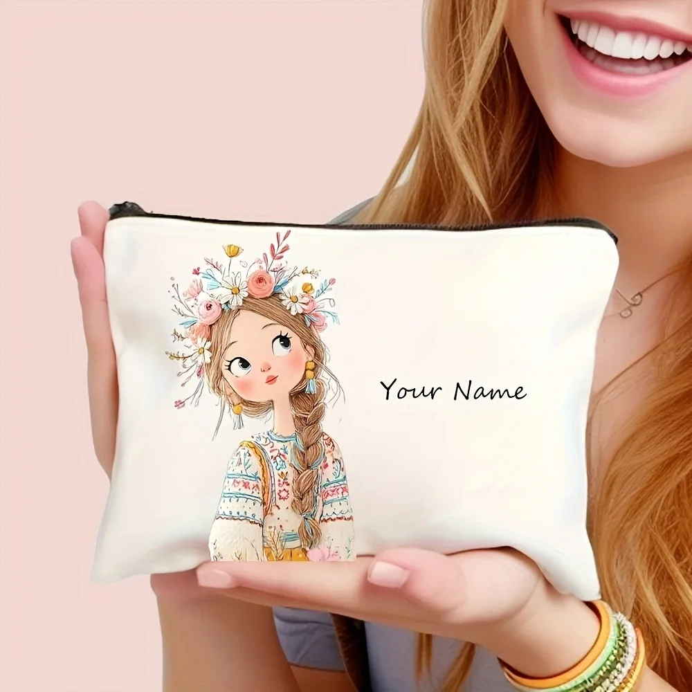 Add Your Name Makeup Bag Cute Girl Pattern Portable Zipper Toiletry Storage Bags Cosmetic Pouch for Women Friend Christmas Gift
