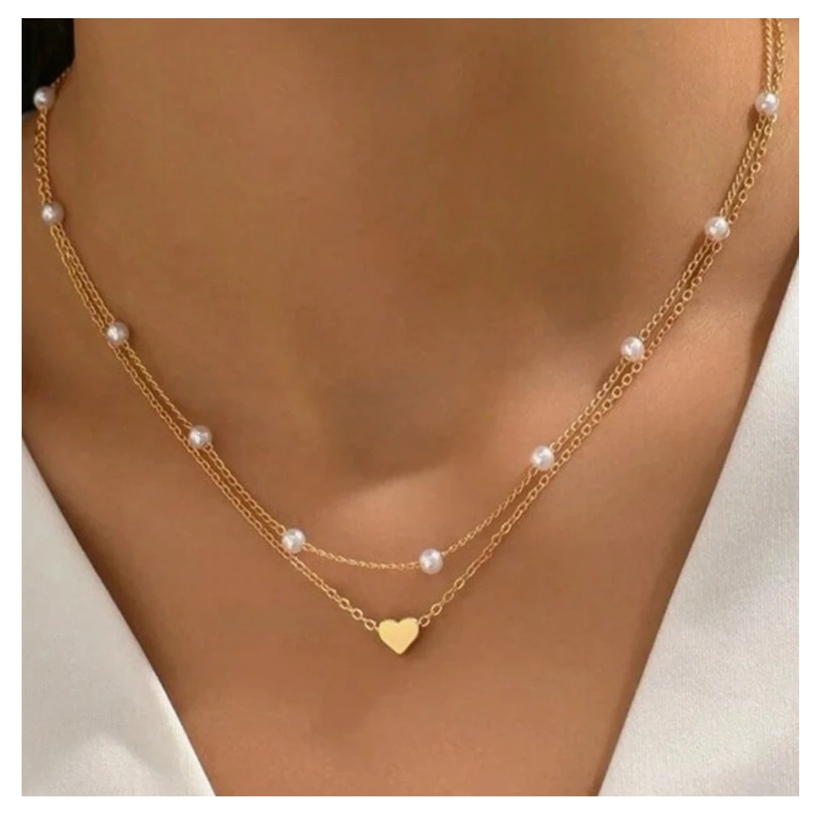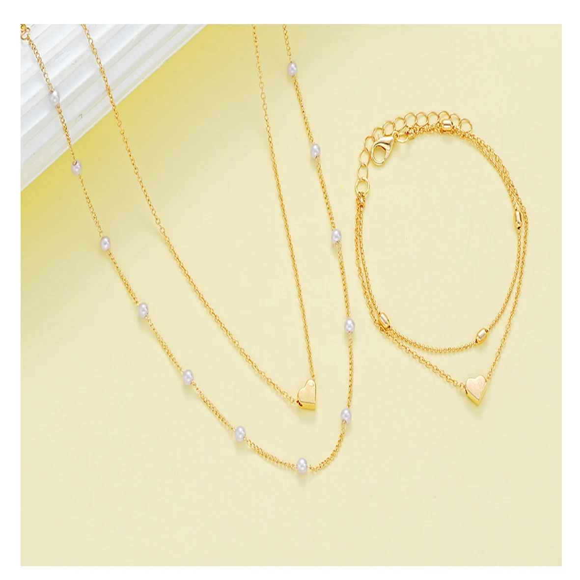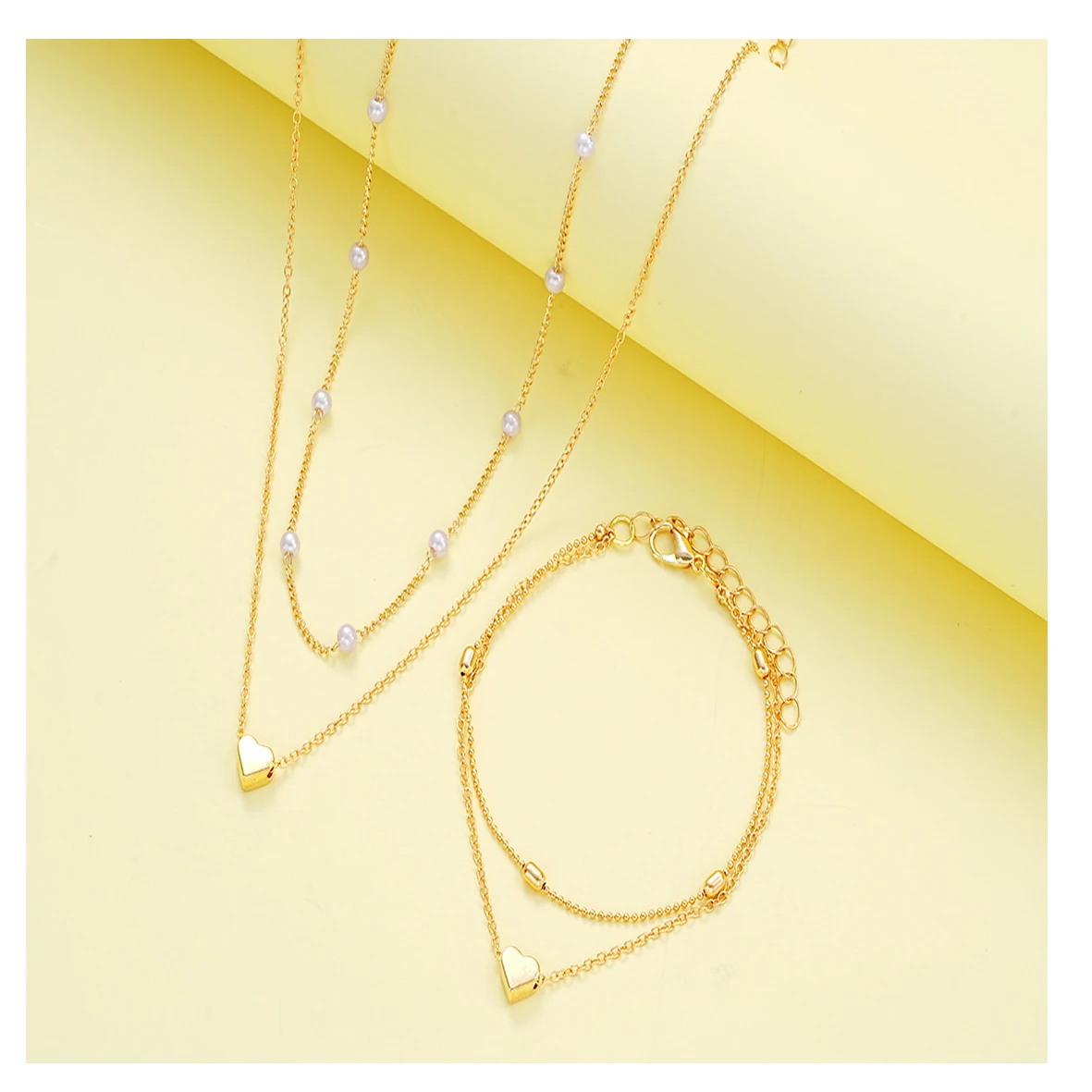 Fashion Imitation Pearl Heart Jewelry Set For Women Gold Silver Color Round Beads Necklace Bracelet Set Daily Wear Accessories