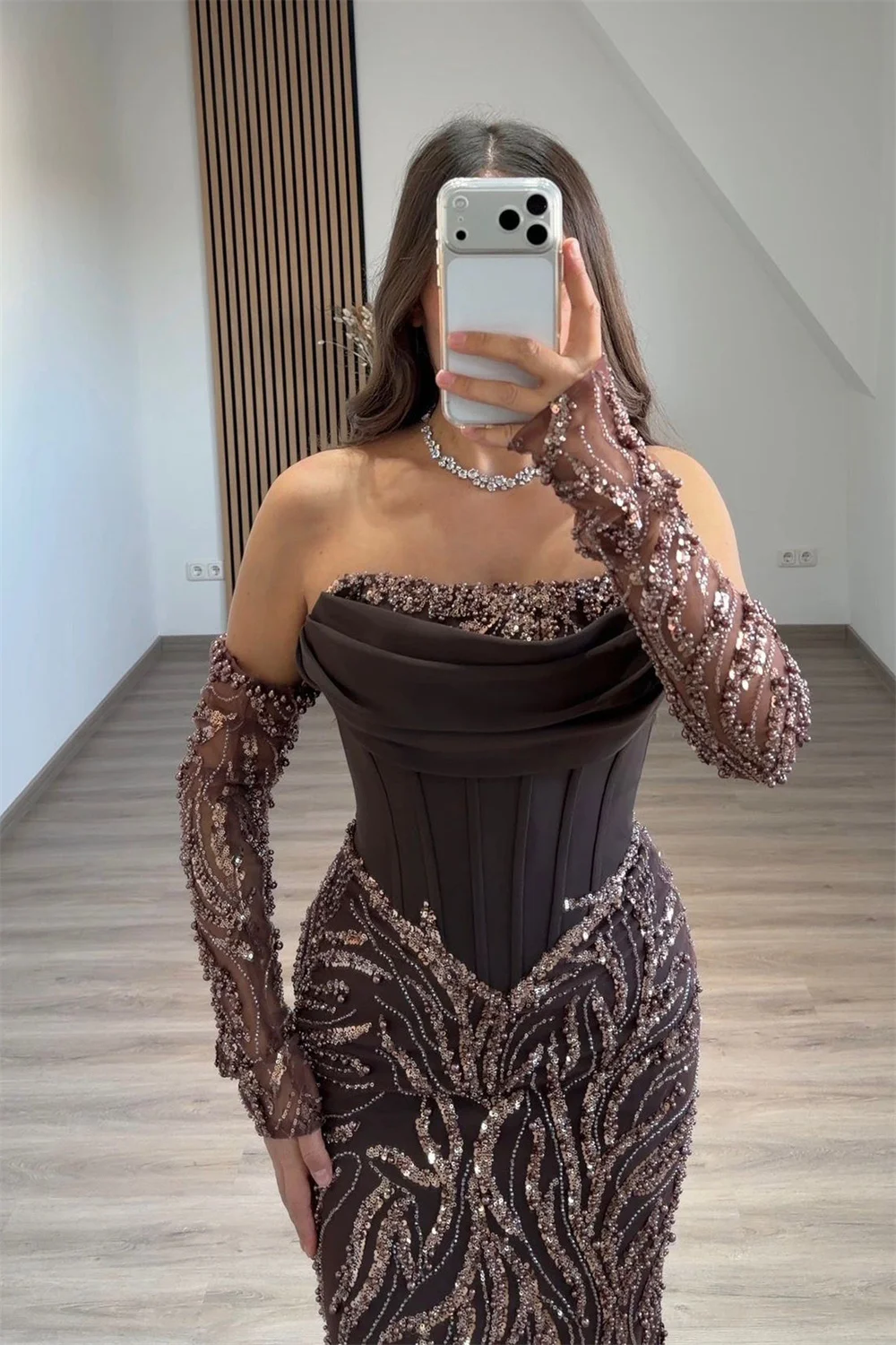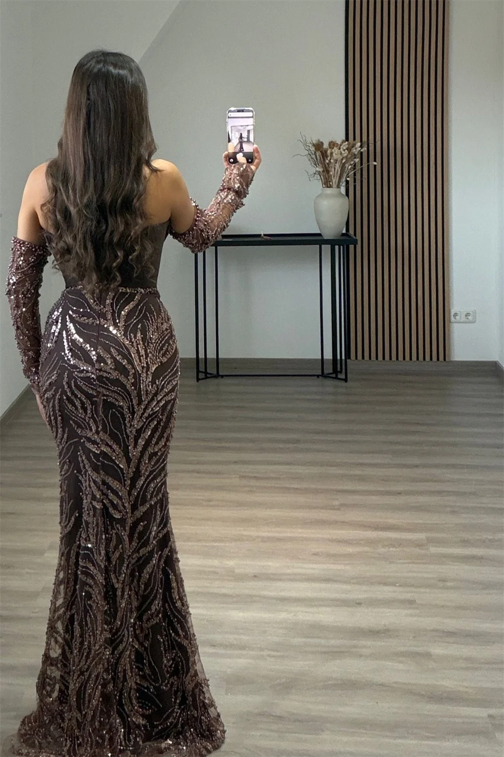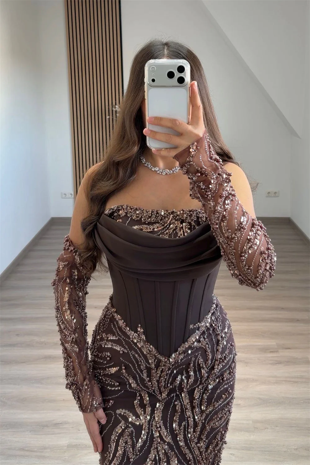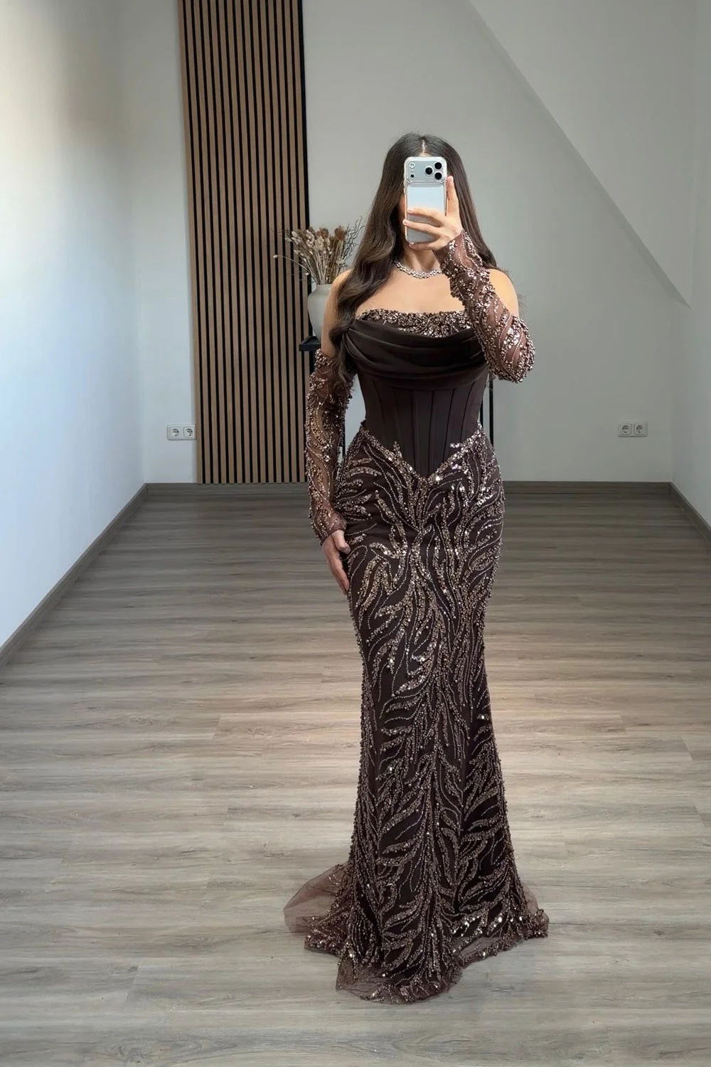 Cathy Customize Brown Shiny Lace Mermaid Prom Dress Long Sleeves Floor-length vestidos de noiva Elegant Zip Back Evening Dresses