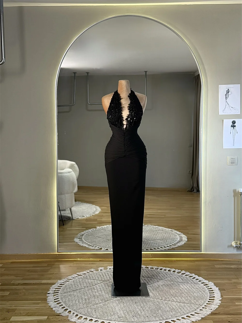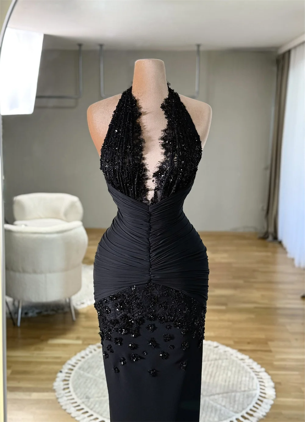 Cathy Customized Black Lace Halter Neck Sequins Prom Dresses Sleeveless Floor-Length vestidos de noiva Mermaid Formal Evening