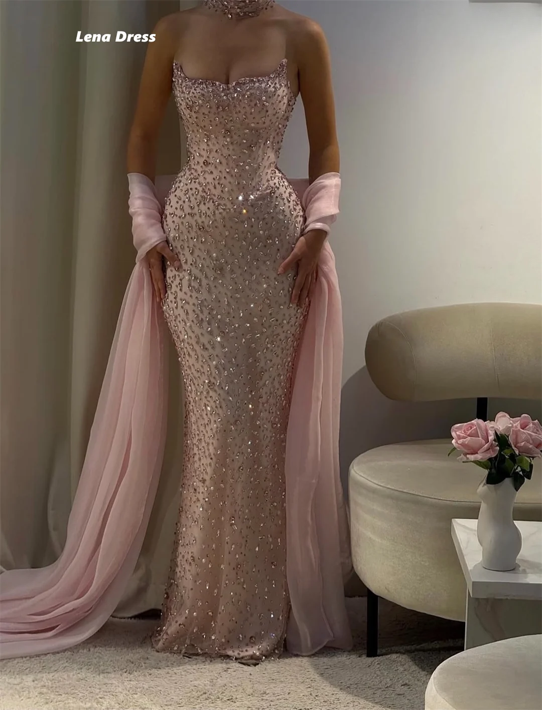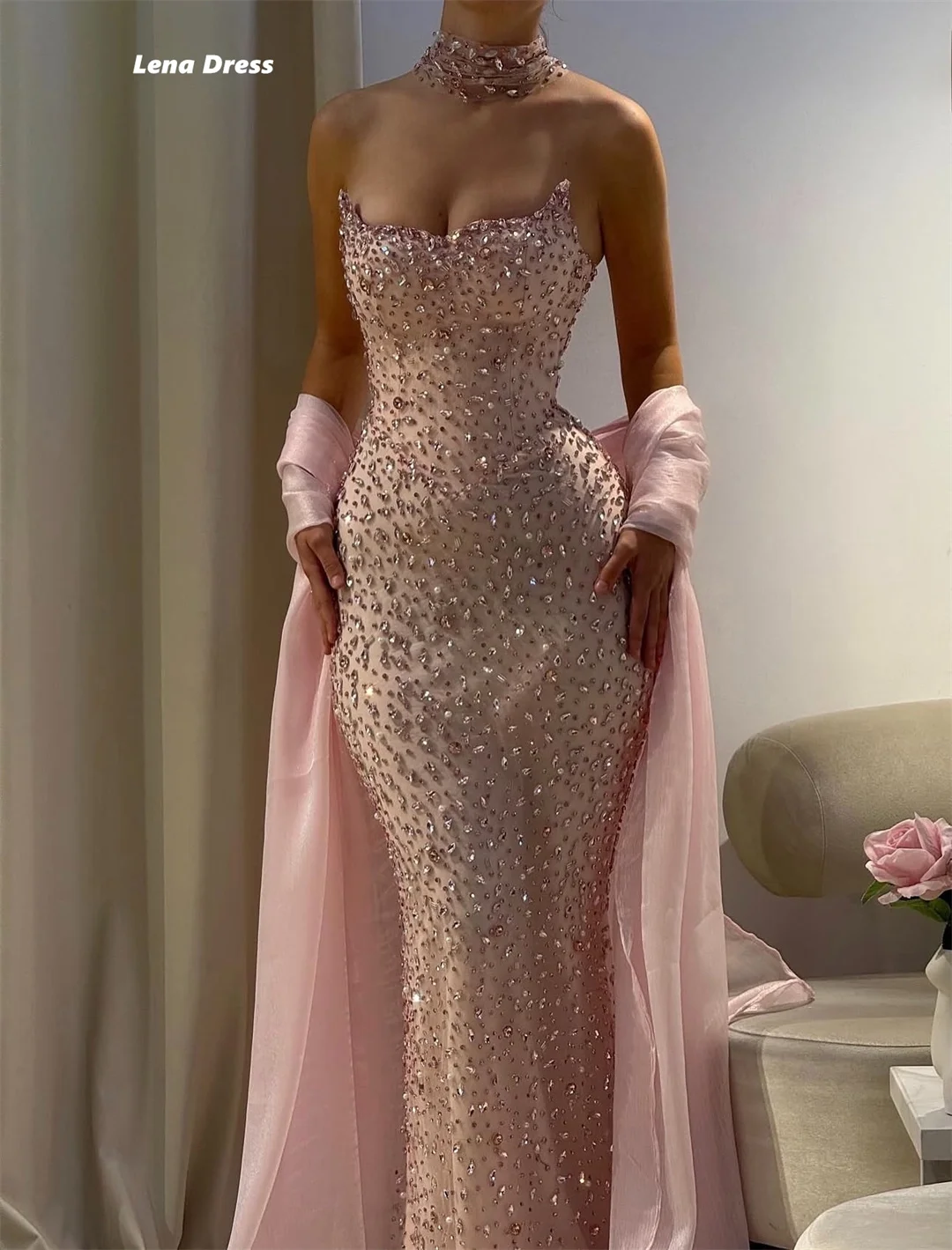 Lena Customized Woman Party Dresses for Special Occasions Rhinestones Elegant Long Dress Pink Shiny Prom Gown Fish Tail Evening