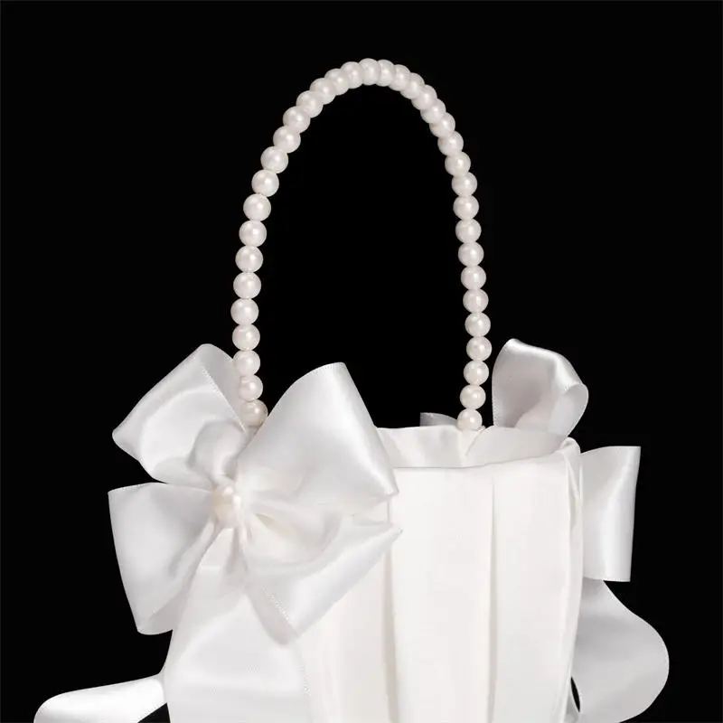 1-2pcs Pearl Handle Flower Basket Satin White Western Rustic Bowknot Wedding Basket Foldable Flower Basket For Floral Petals