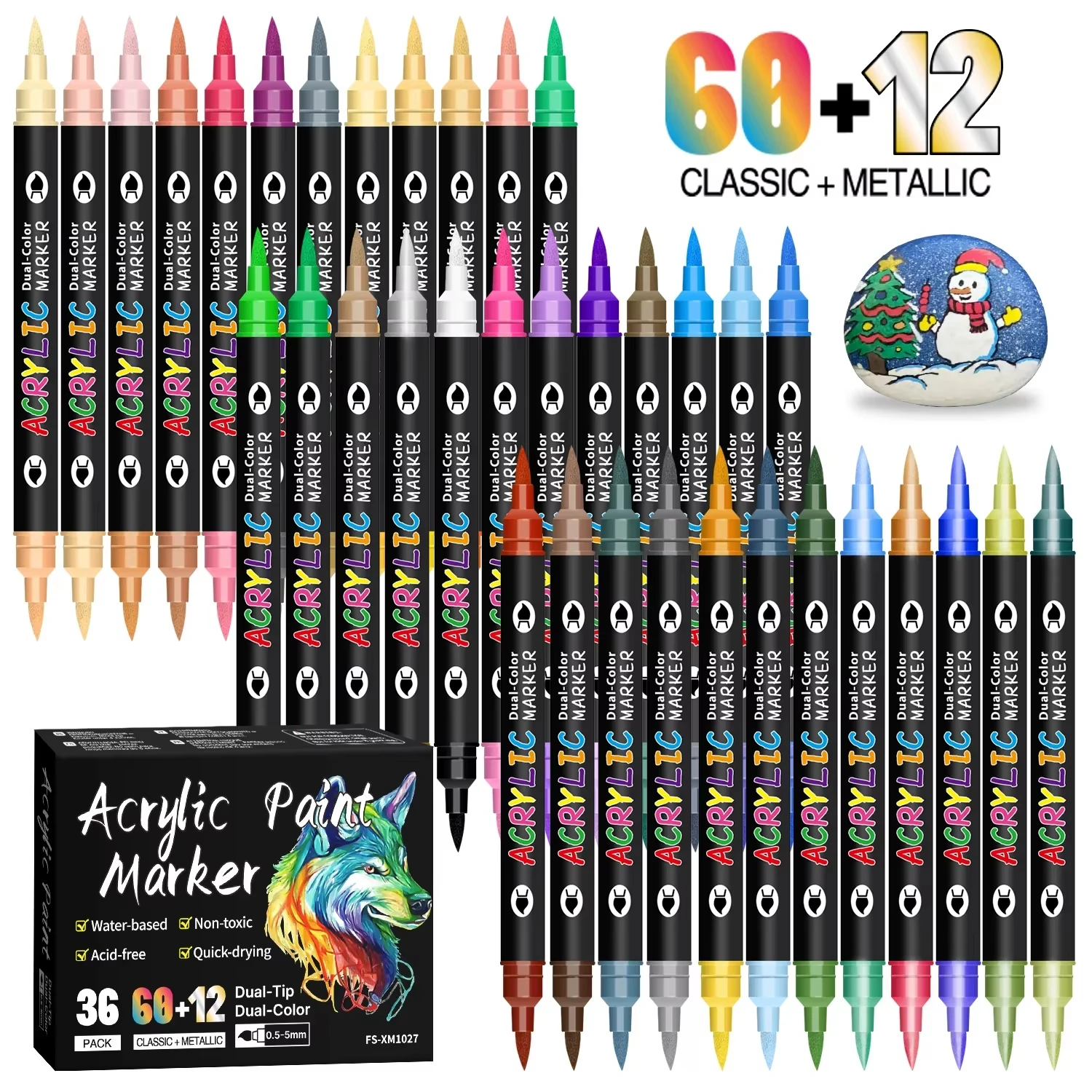 24/48/72/144 Colors Acrylic Paint Markers,Dual tips Dual Color for Rock Painting,Canvas,Glass,Ceramic,Fabric,Plastic,Soft Brush