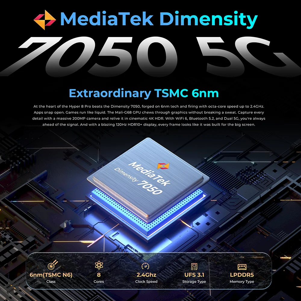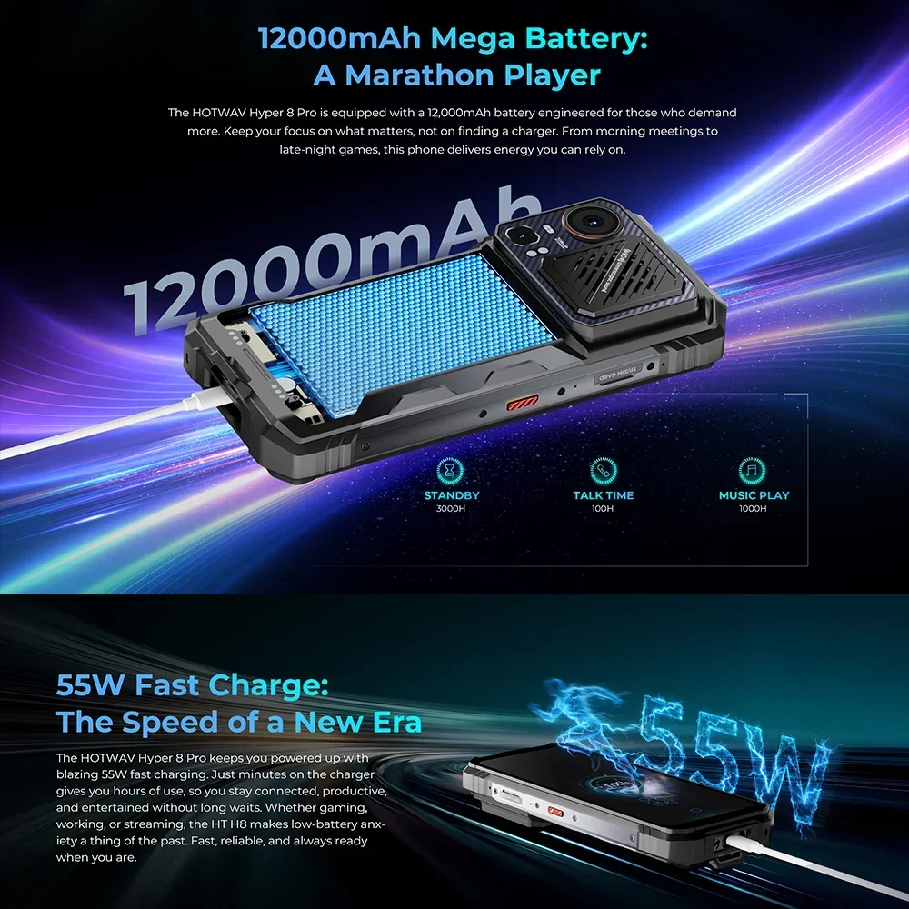 HOTWAV Hyper 8 Pro 5G Rugged Phone 6.8“ 12GB+512GB Mobile Phone 108MP Camera 12000mAh 55W NFC Dimensity 7050 20MP Night Vision