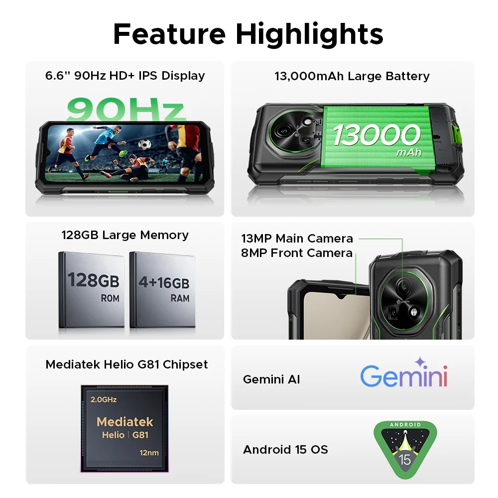 Global Version DOOGEE Fire 5 Pro Rugged Phone MTK Helio G81 13000mAh Large Battery 20GB+128GB 6.6'' HD+ NFC 13MP Android 15