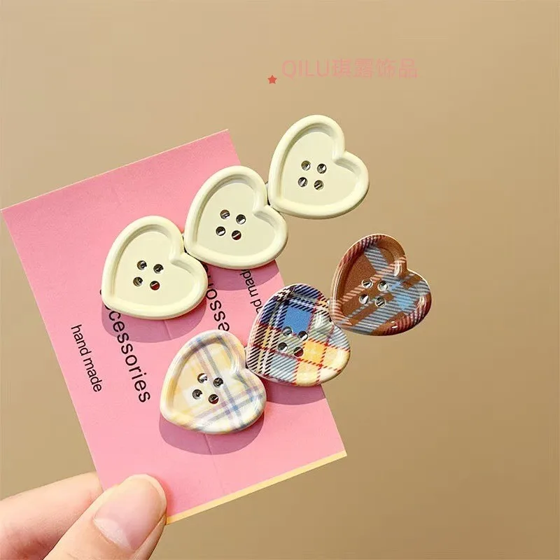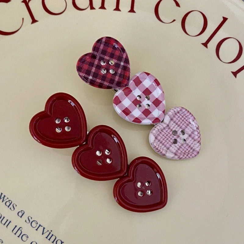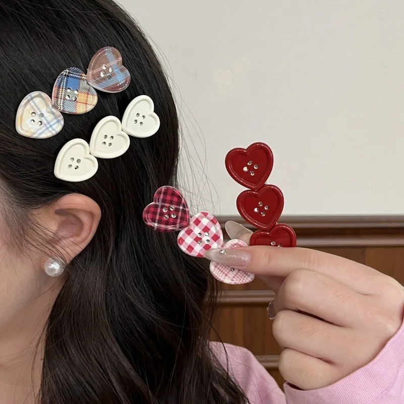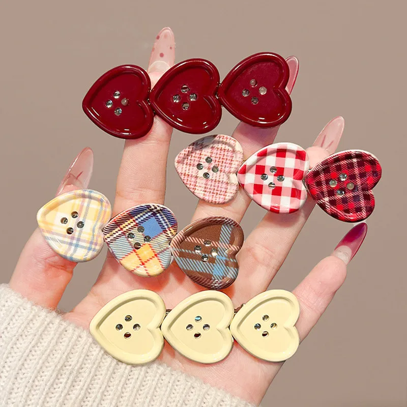Sweet Check Love Button Hair Clip Side Bangs Girly Cute Duckbill Clip Hair Accessories