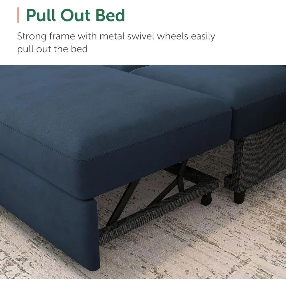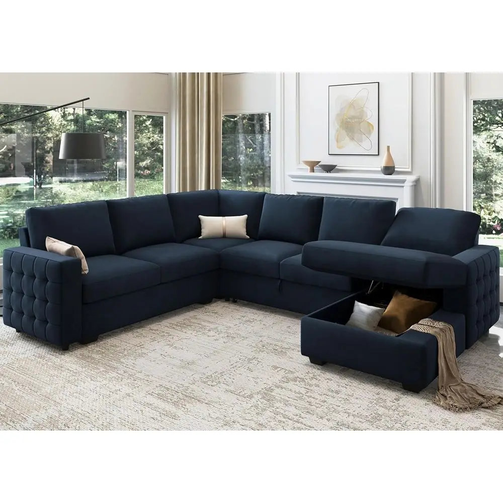 U-Shaped Sectional Sleeper Sofa with Pull-Out Bed, Storage, and Chaise Lounge, Velvet Blue, 6-Seat Living Room