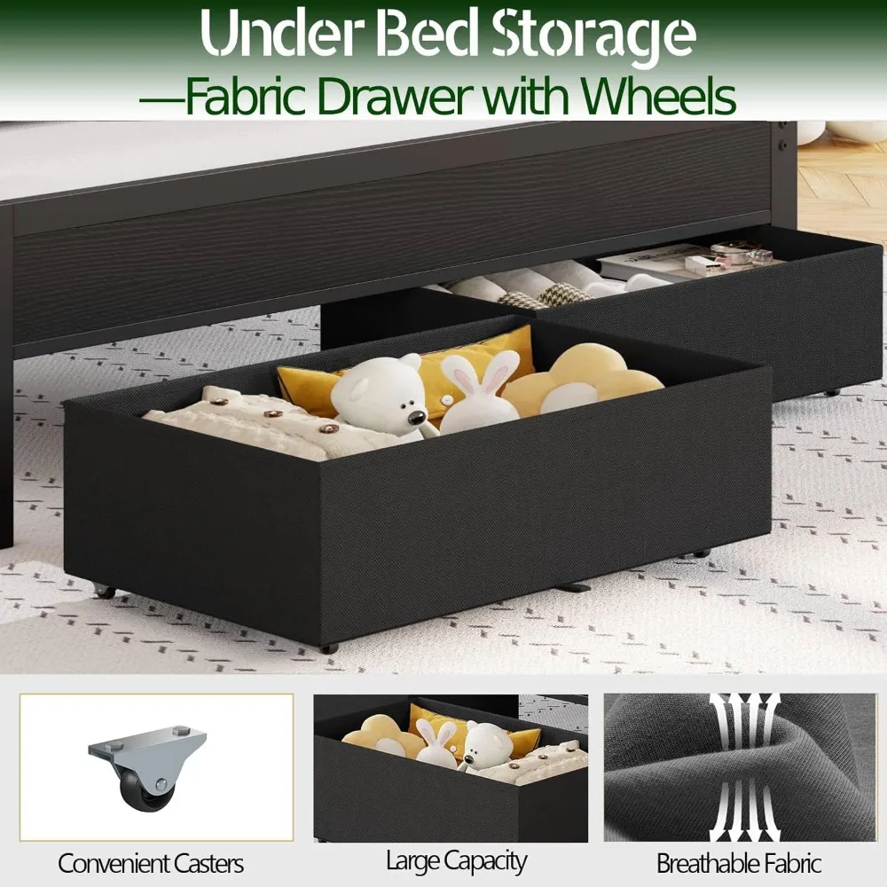 Bed Frame with Charging Station and LED Lights, Grey Upholstered Headboard with Shelves, Metal Platform Bed, Customized