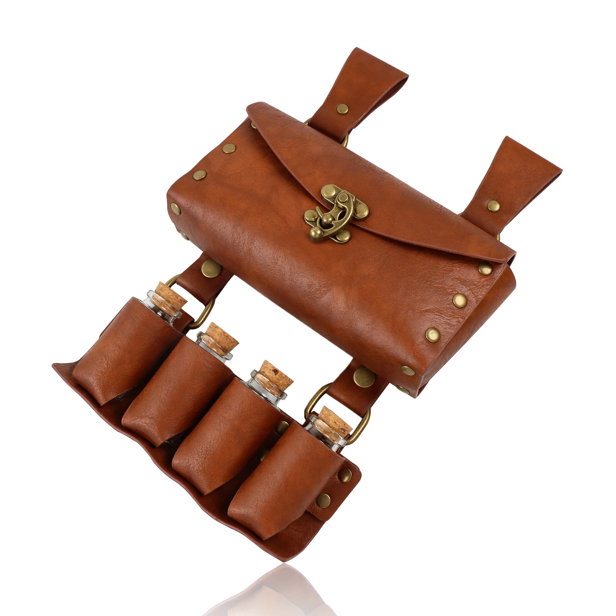 Medieval Retro Steampunk Studded Faux Leather Waist Bag for Coins and Necessities with 4 Glass Bottles for Outdoor Adventures