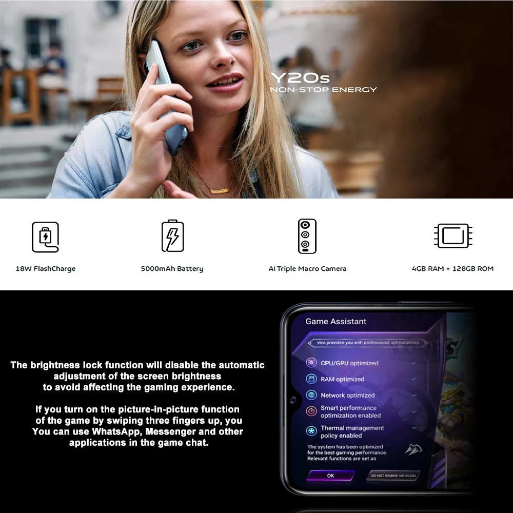 aliexpress , ali , shop , ali shop , online , store , online shop , online store , buy , sell , VIVO Y20S 4G fashion camera phone 13mp+2MP+2mp camera, 8GB+256gb 5000mAh battery, long battery life, support NFC function