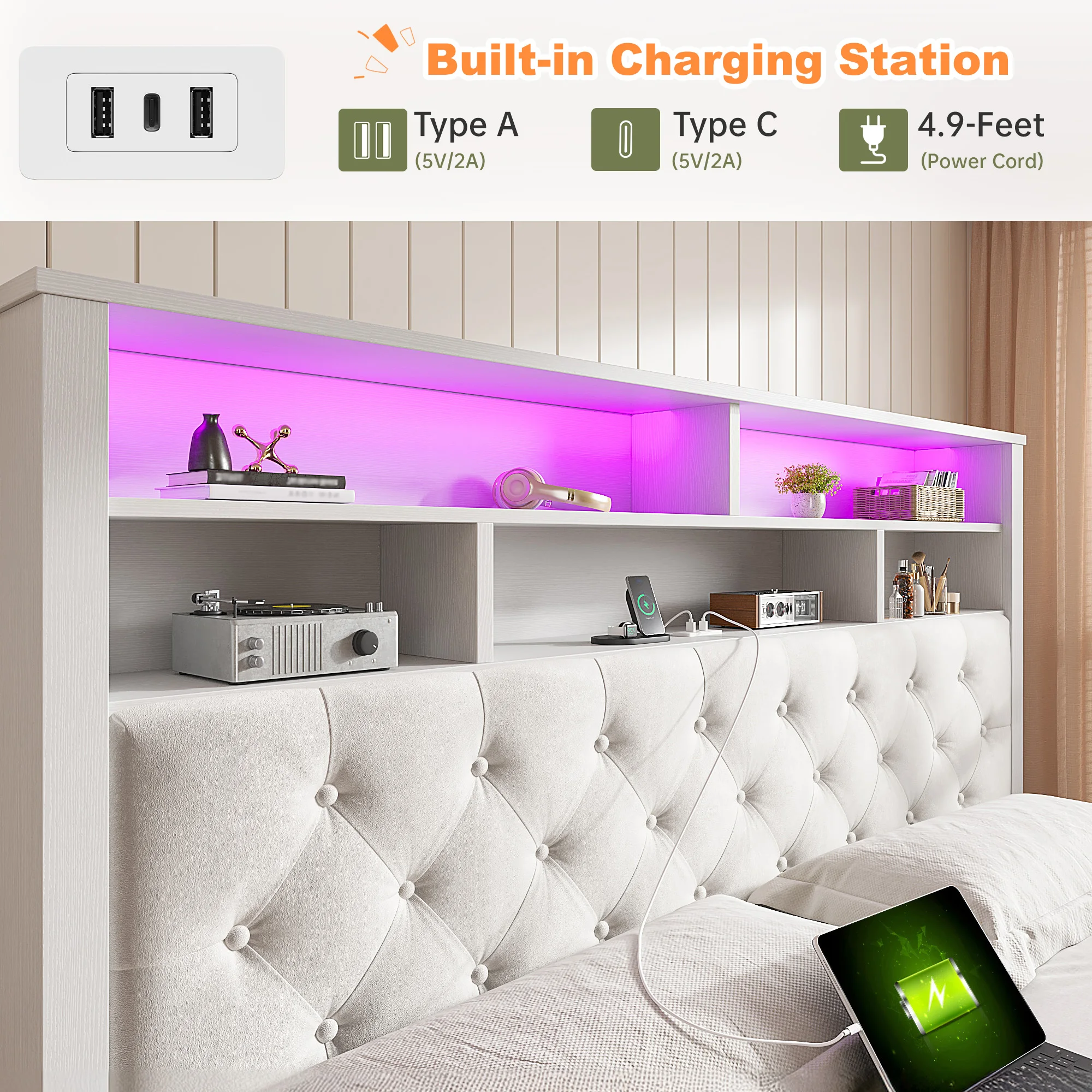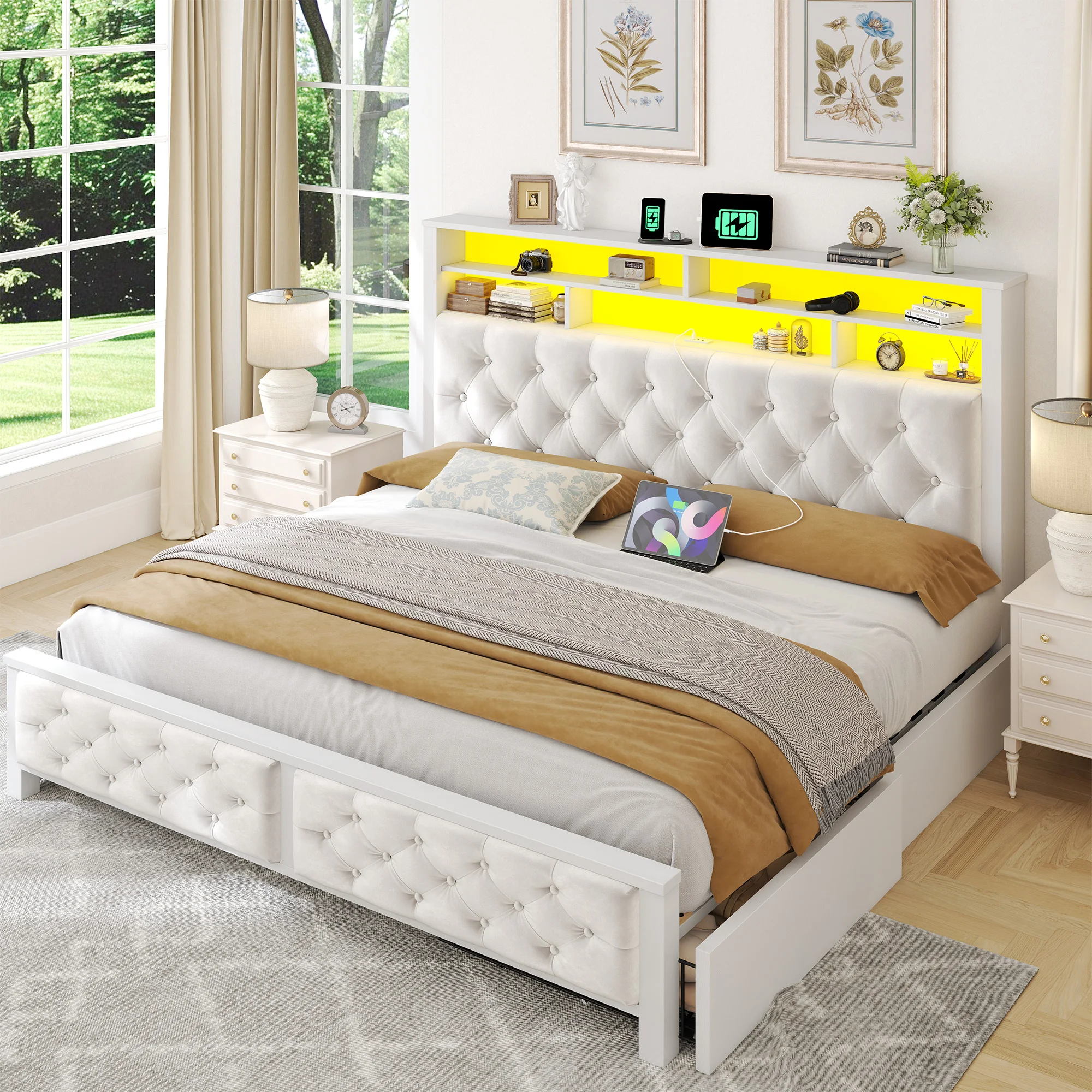 ALI shop - search results ... ... Full/Queen/King Bed Frame with LED Lights and Charging Station Platform Bed with 4 Drawers and Bookcase Headboard No Noise ::: 2021 ::: :::