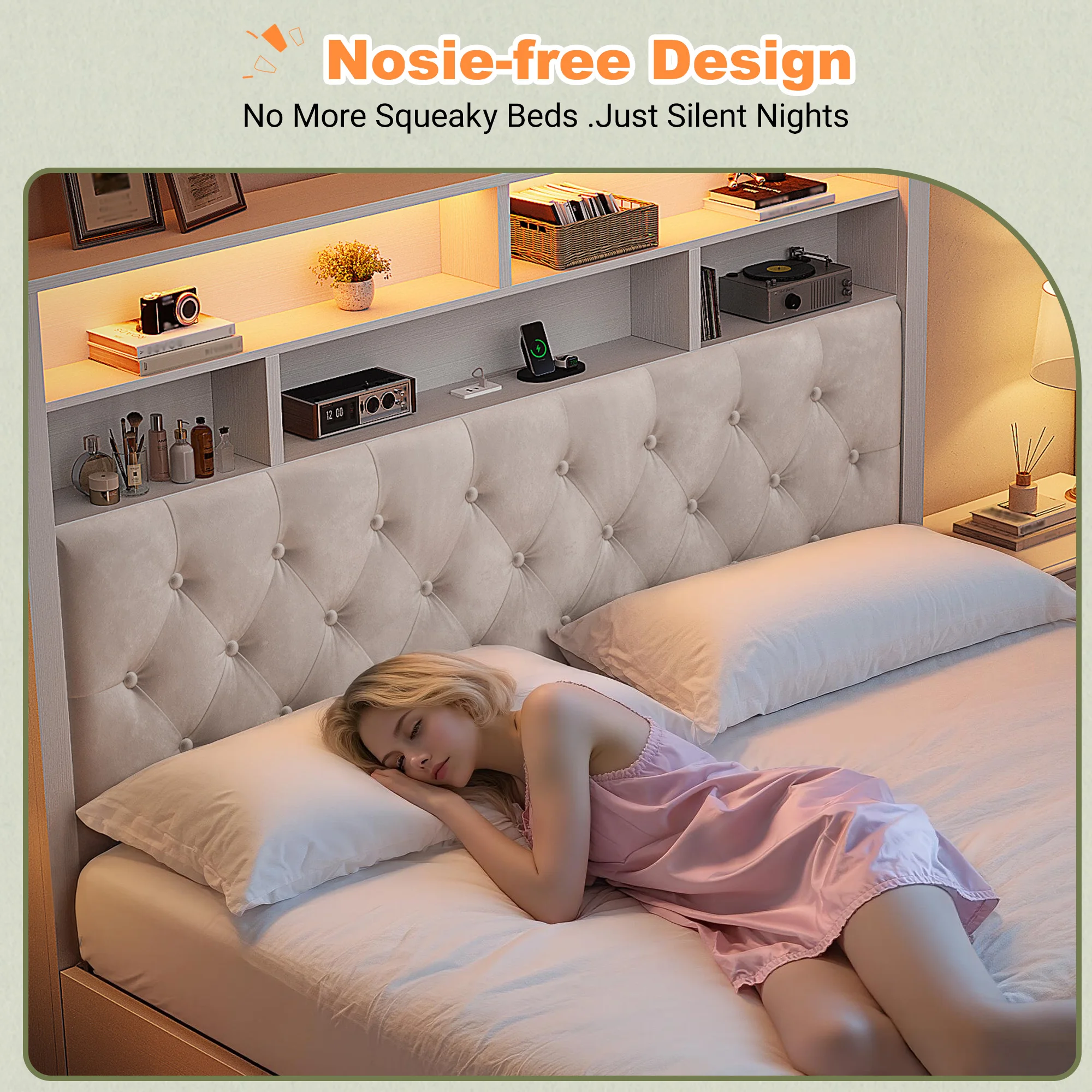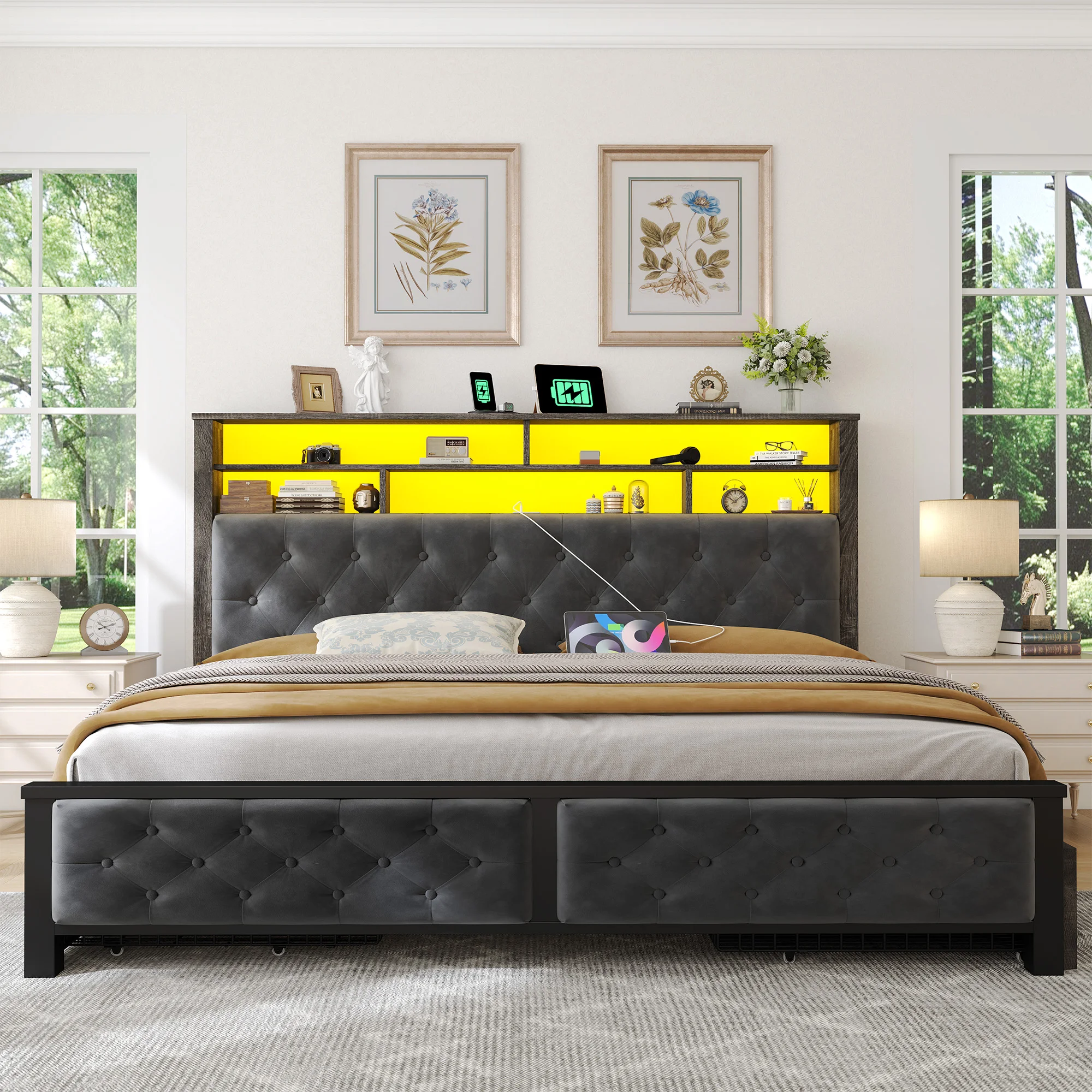 aliexpress , ali , shop , ali shop , online , store , online shop , online store , buy , sell , Full/Queen/King Bed Frame with LED Lights and Charging Station Platform Bed with 4 Drawers and Bookcase Headboard No Noise