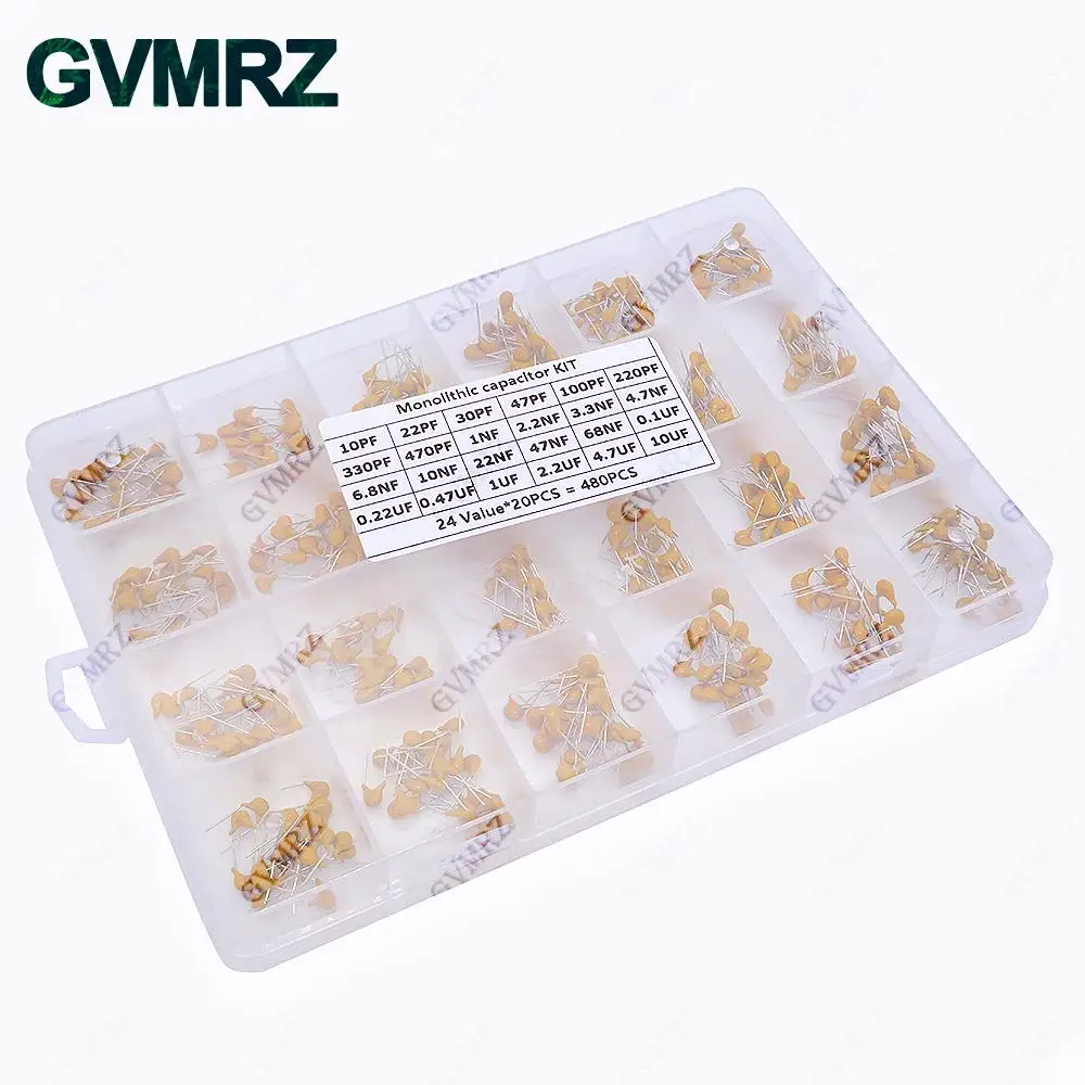 480PCS 24Values Monolithic Ceramic Capacitor Kit (10PF-10UF) Boxed for Electronic Circuit Coupling & Signal Filtering Projects