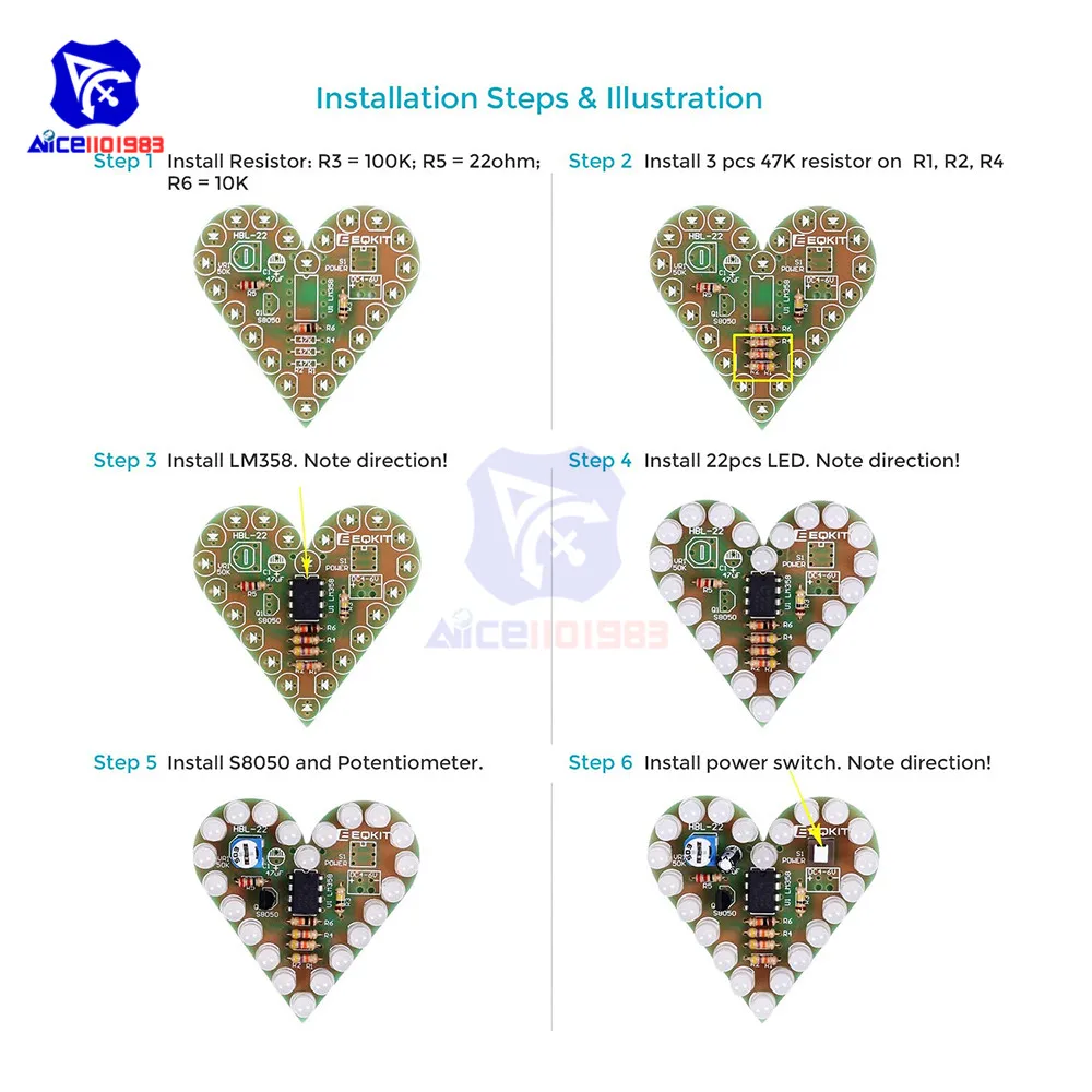 diymore Heart Shape LED Flashing Light DIY Kit with PCB DC 4-6V 4 Color Available for Soldering Kit Practice Learning Kit
