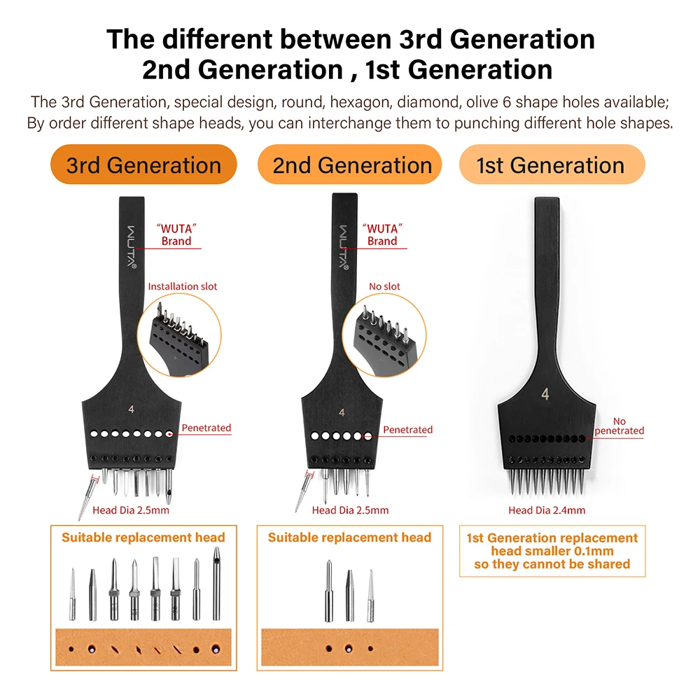WUTA 3G Leather Punches Head Replaceable Pricking Iron Removable Diamond Olive Round Hole French Style Chisel DIY Craft Tools