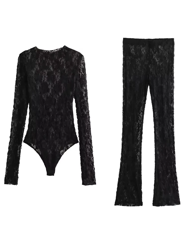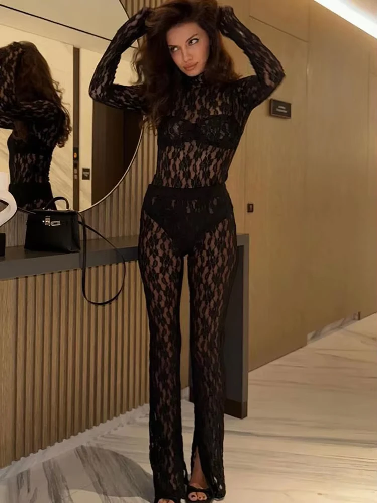 HH Women New Fashion Versatile Lace Jumpsuits Long Sleeves Hollow Out Slim Onesies Female Elegant Wild Women's Bodysuits