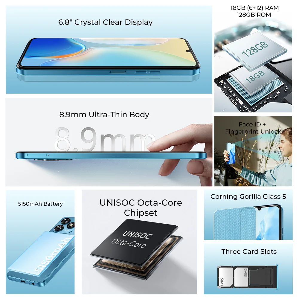 Oukitel C51 Mobile Phone 6.8'' HD+ 5150mAh, 6GB +128GB Mobile Phone 13MP Main Camera, Three Card Slots
