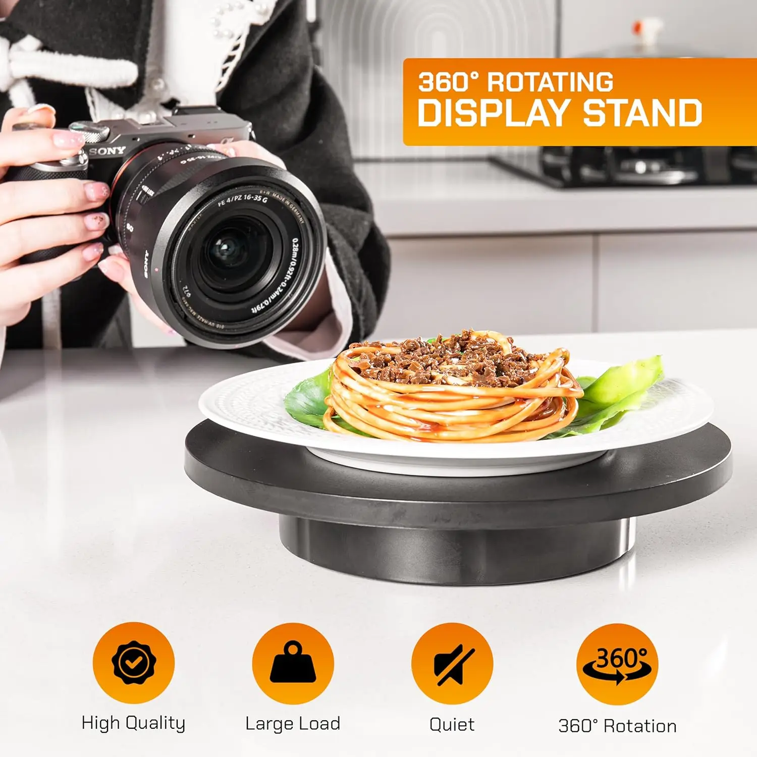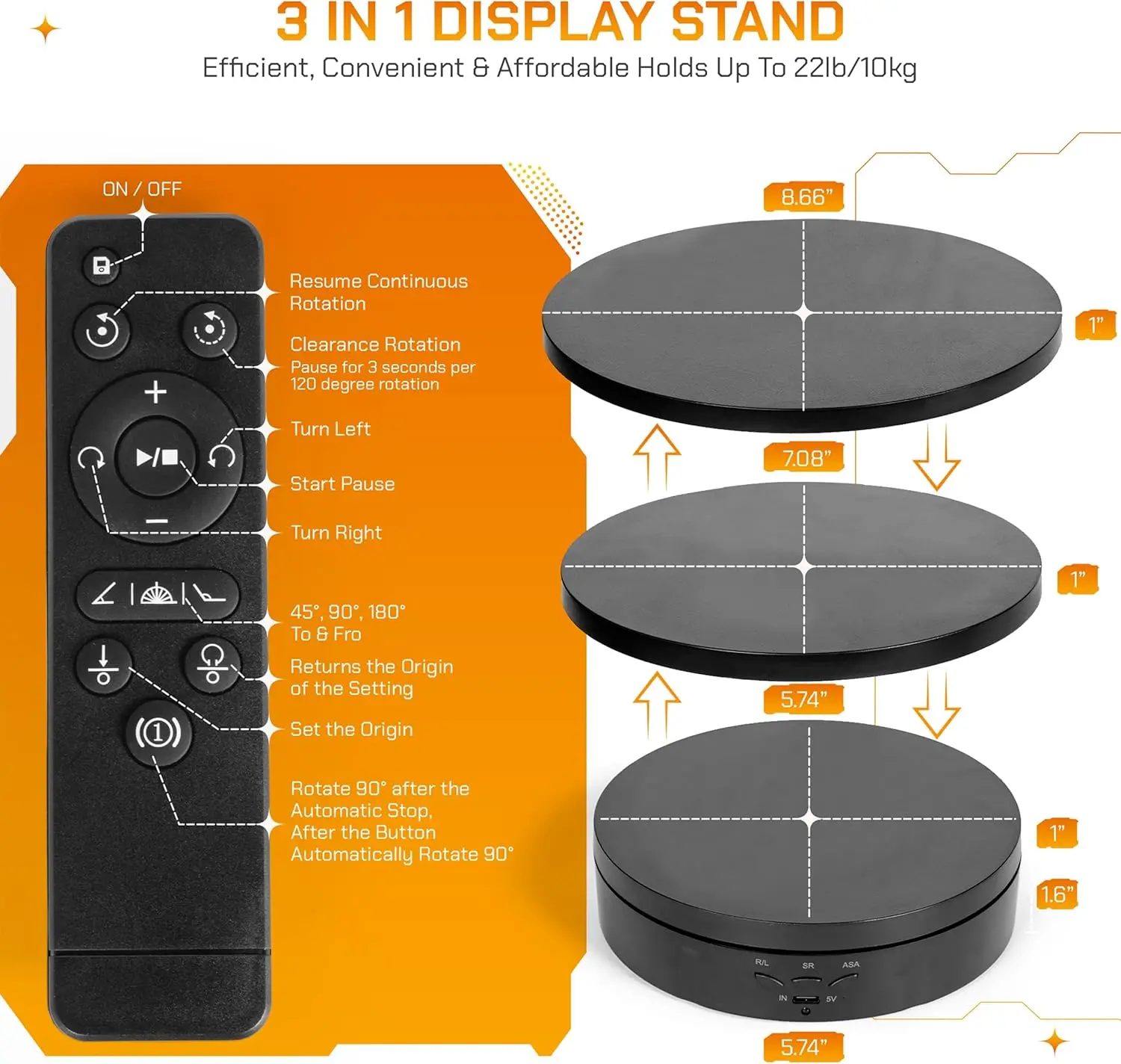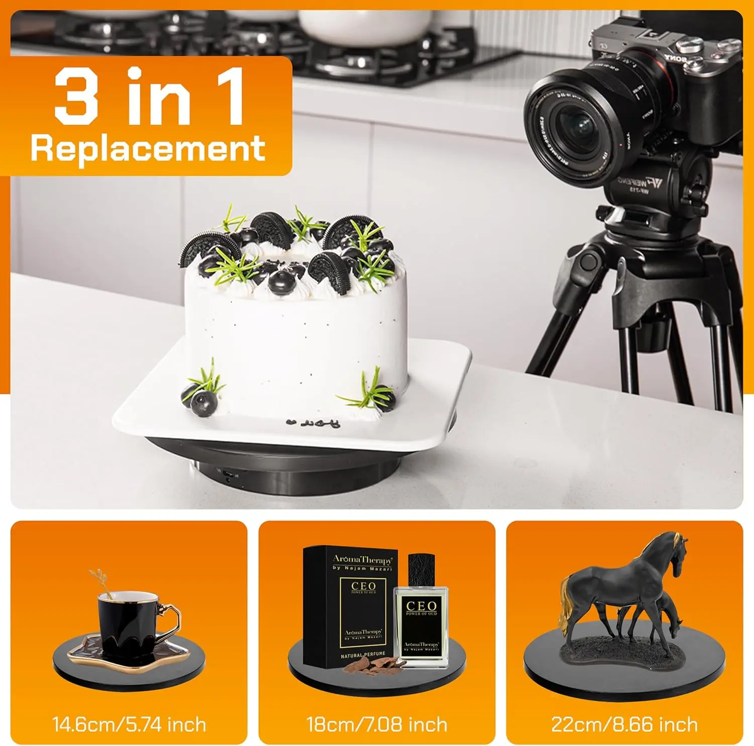 Control Motorized RotatingDisplaystand-360°Electric RotatingPlatform|3-in-1 Sizes -5.74'',7.08''and8.66''Covers-Rechar geable Table