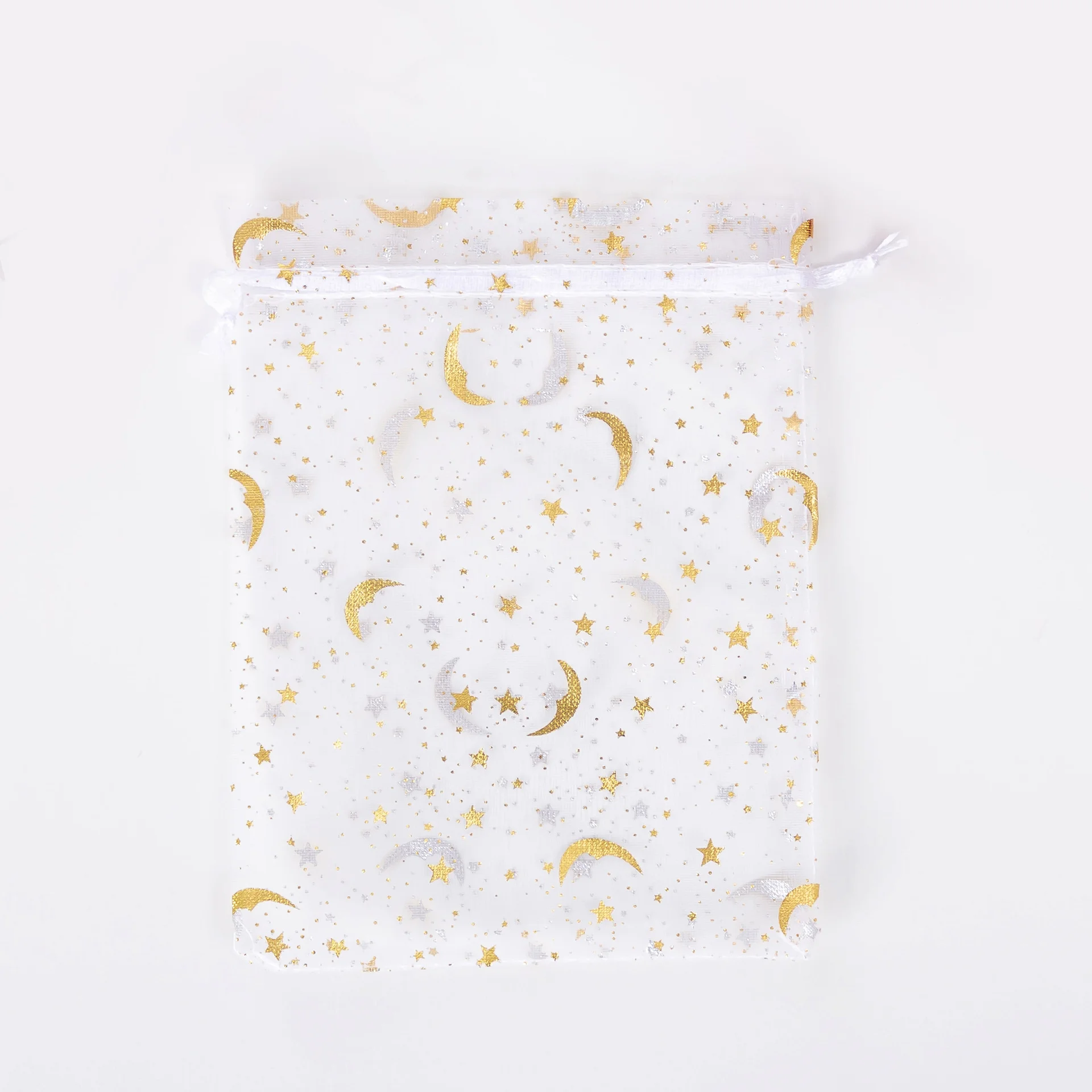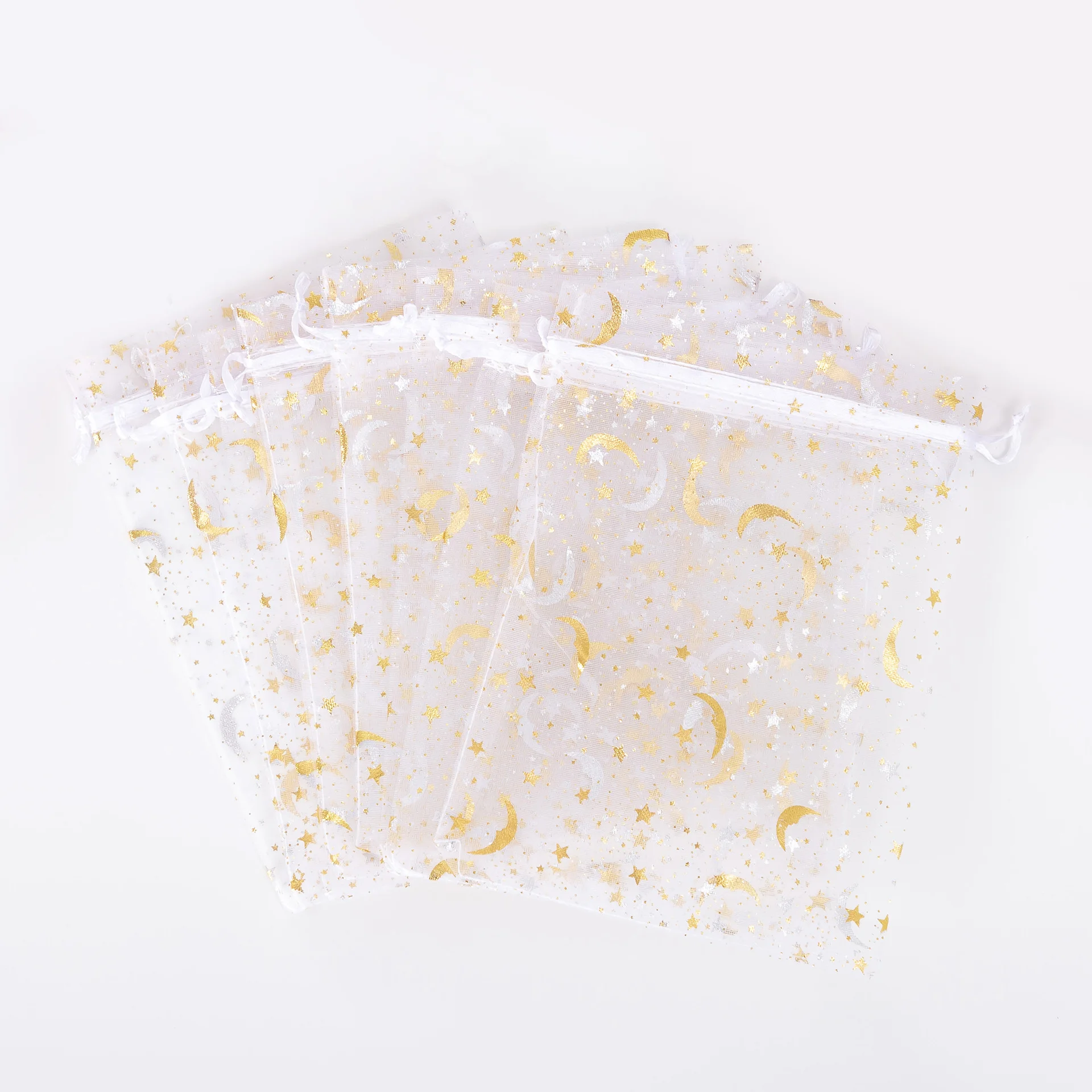 50PCS White Moon Stars Drawstring Organza Bags Jewelry Gift Bags Pouches Gold Star Organza Favor Pouches for Christmas Wedding