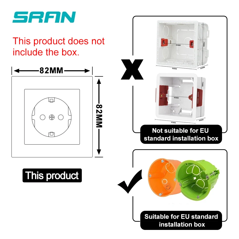 SRAN EU RU Wall Electrical Socket 16A 220V 82*82mm Tempered Glass Power Outlet Home Improvement White/Black