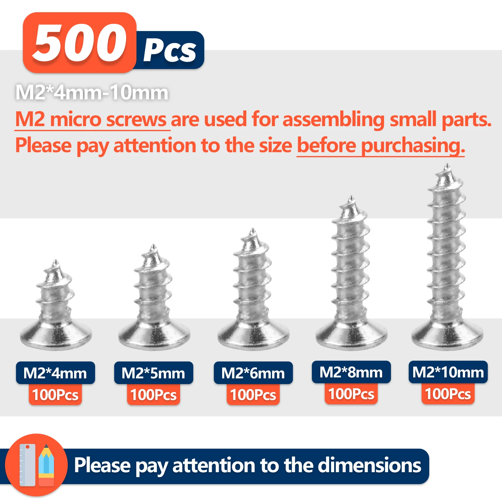 500pcs M2 Self Tapping Phillips Screws Assortment Kit 5 Sizes Alloy Steel Cross Drive Flat Head Self Drilling Wood Screws DIY