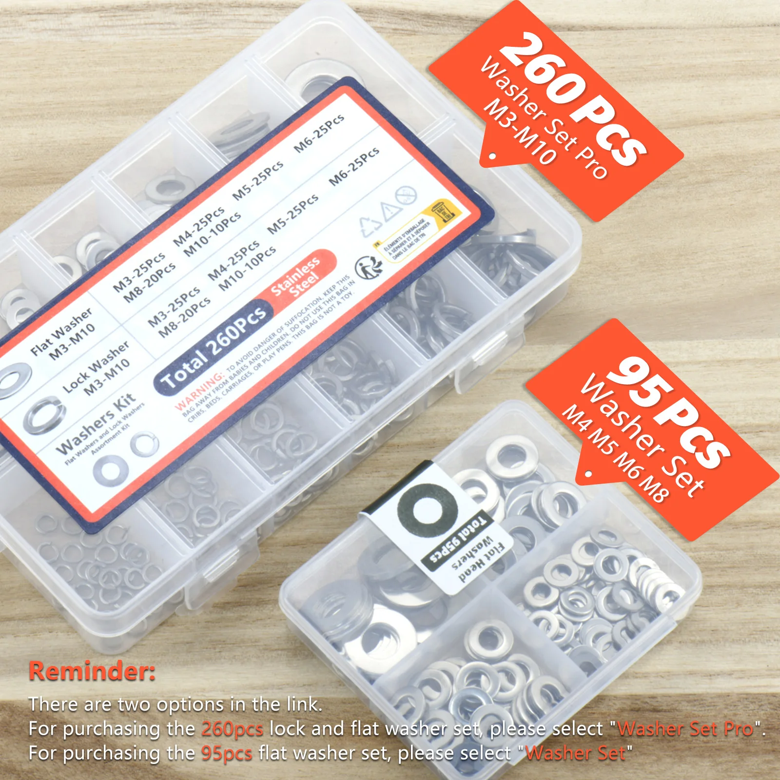 260pcs/95pcs Lock and Flat Washer Assortment Kit Stainless Steel M3 M4 M5 M6 M8 M10 Spring Lock Washers and Flat Washers Set