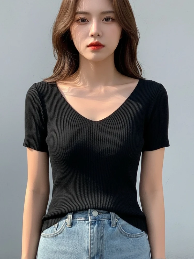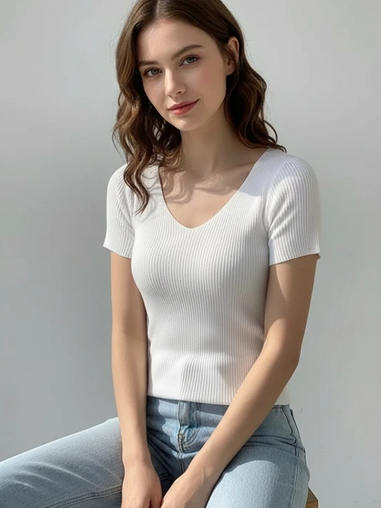 AOSSVIAO 2026 Summer Basic V-neck Solid Thin Women Pullover Female Knitted Ribbed Sweater Slim Short Sleeve Bodycon Sweater