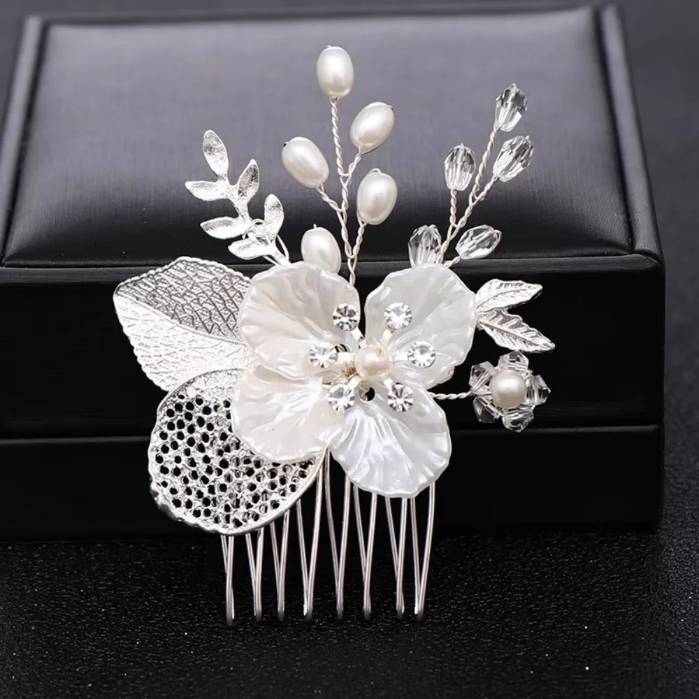 A bridal wedding headpiece, gold leaf hollow mesh pearl flower small hair comb, hair accessory, dress accessory