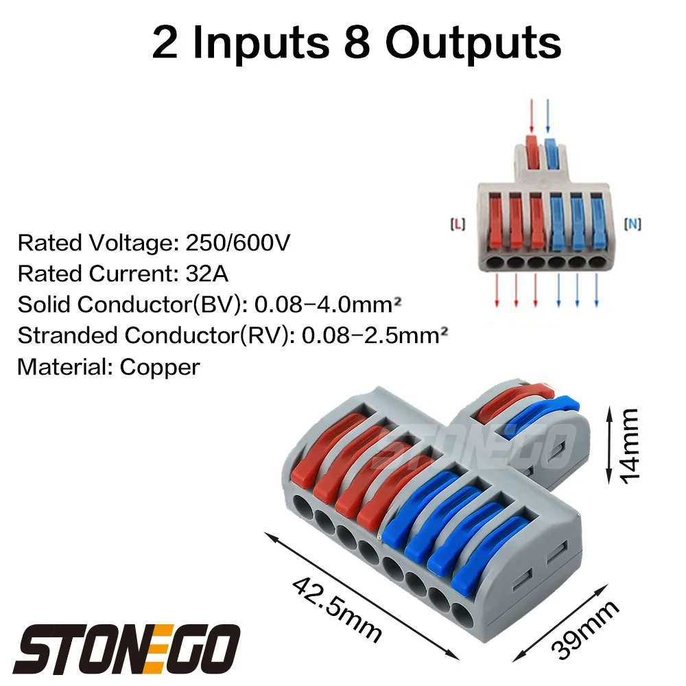 STONEGO 2 in 4/6/8 Out Wire Splitter Terminal Fast Connector Compact Wiring Cable Connector for Electrical Installations