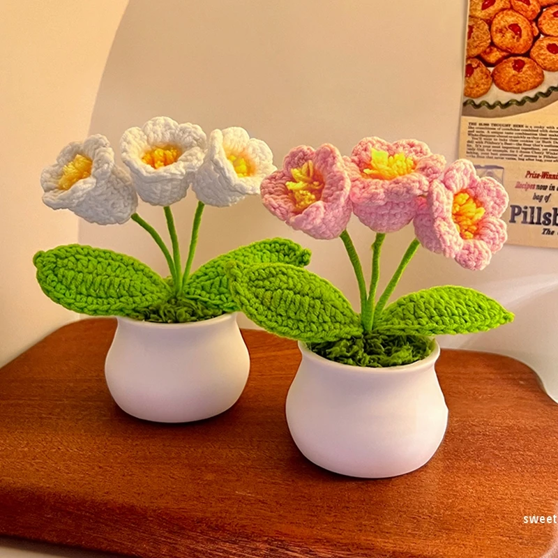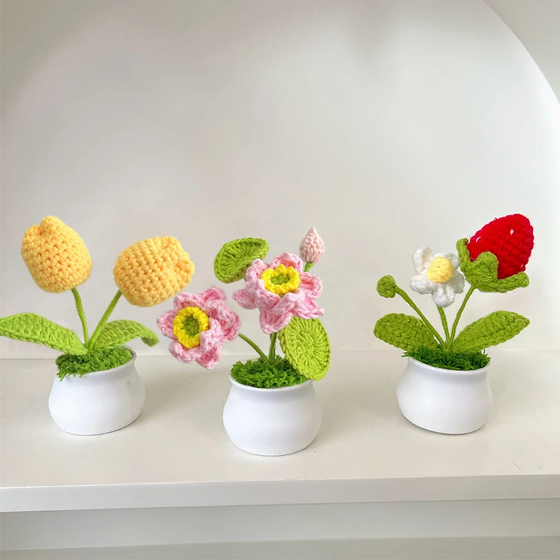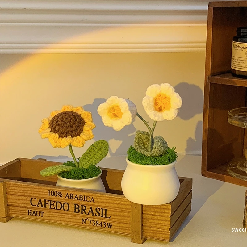 Crochet Flowers Potted Handmade Knitting Sunflower Tulip Pot Office Desktop Ornaments Car Interior Decoration Eternal Flower 제습기