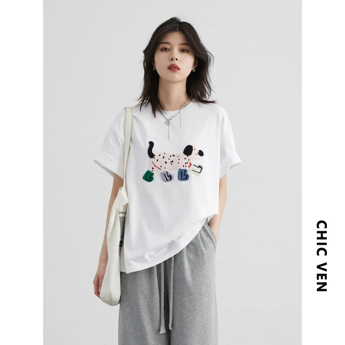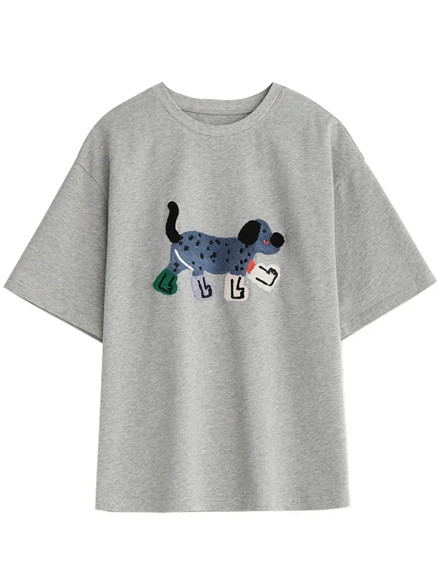 CHIC VEN Women T-Shirts Loose Streetwear Uni Fun Dog Embroidered Short Sleeve Cotton Girl Tees Female Top Summer 2025