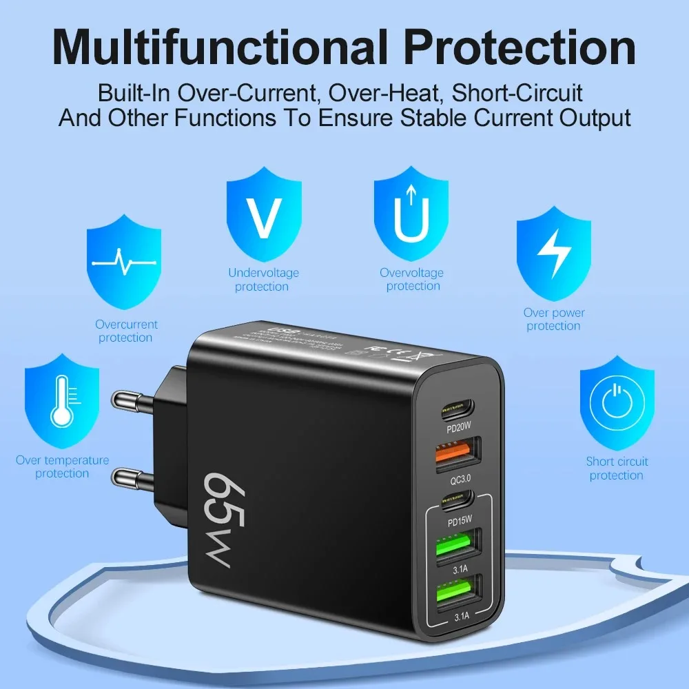 Total 65W USB Charger PD 20W USB Fast Charger 5Ports Quick Charge 3.0 Phone Adapter For iPhone15Pro Samsung Xiaomi Wall Charger