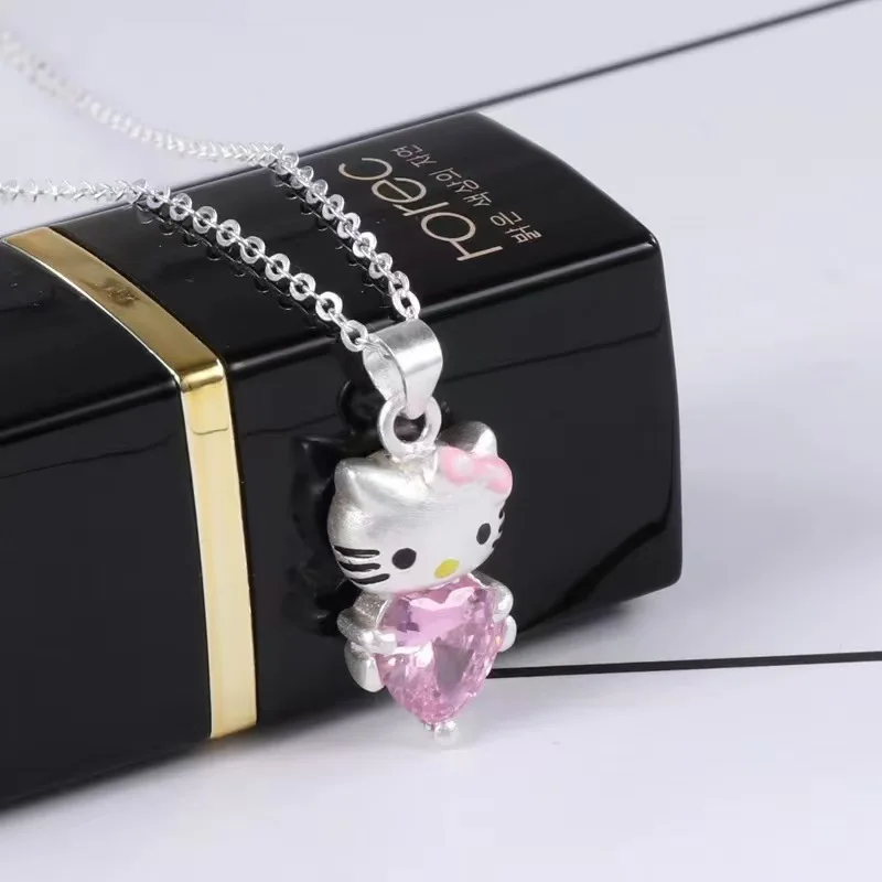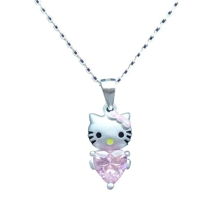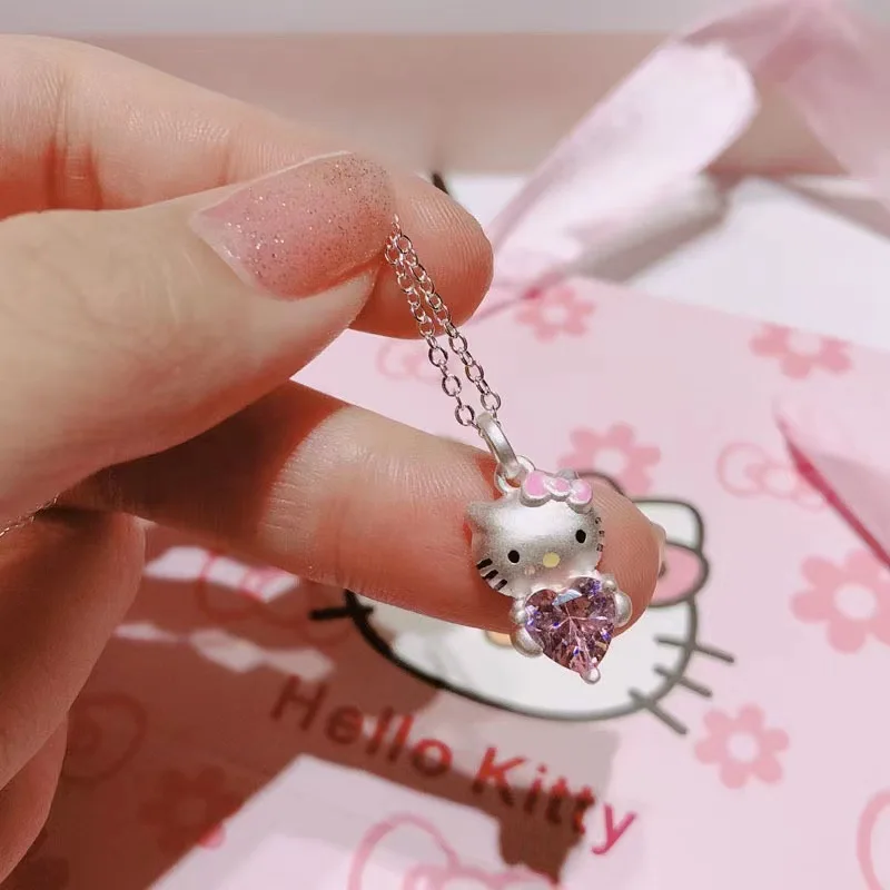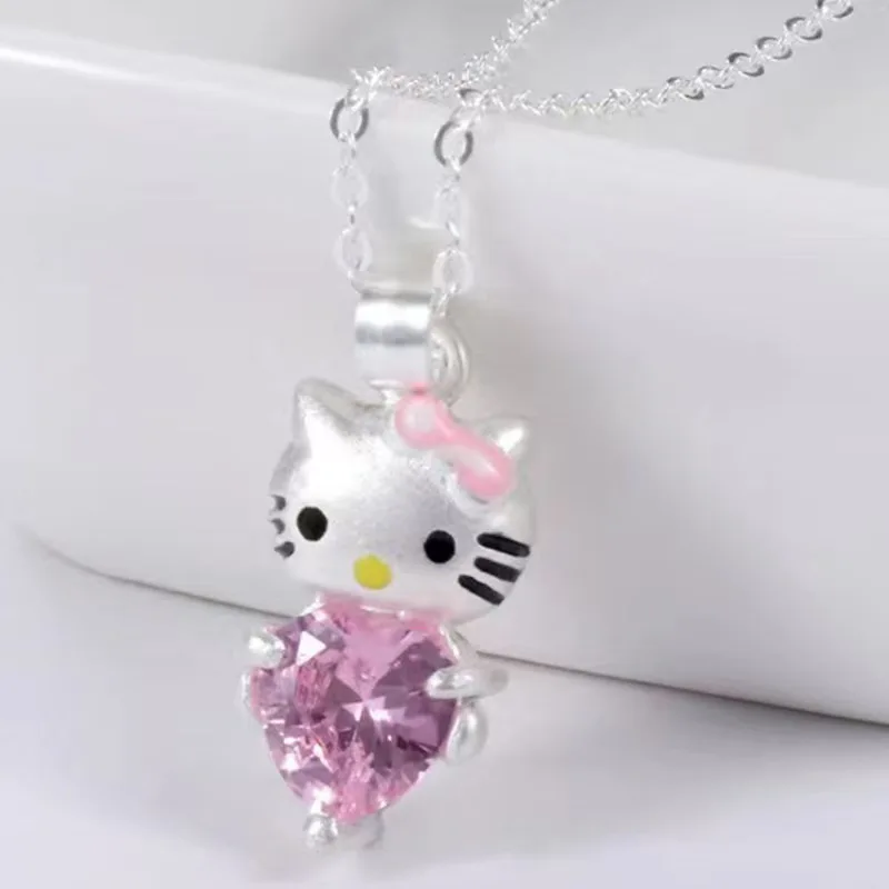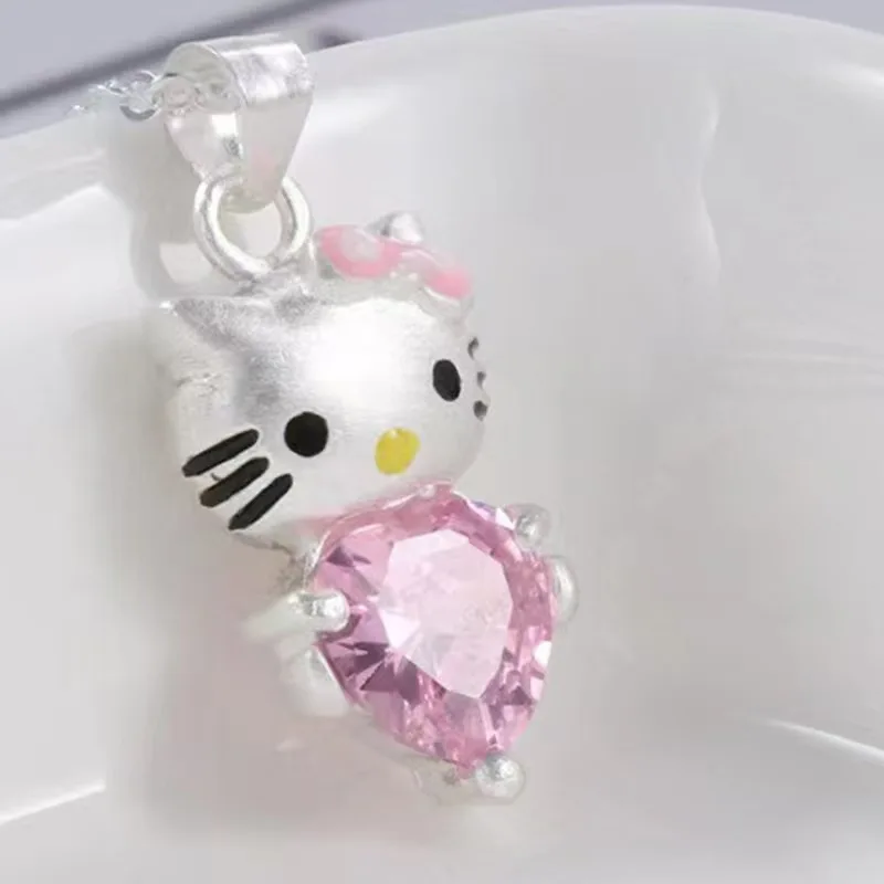 Kawaii Hello Kitty Sanrio Pink Crystal Necklace Silver Alloy Anime Jewelry Chain Female Charm Valentine Accessories Girl Gift