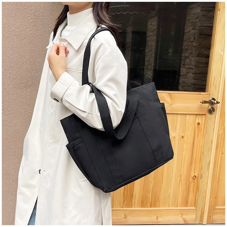 Canvas Women's Bag Large Capacity Multiple Outer Pocket Zipper Shoulder Bag Student Handbag Shopping