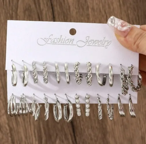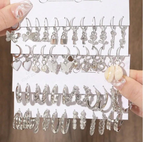 European and American metal earrings 24-piece set, fashionable and simple versatile alloy love pearl snake butterfly mushroom lo