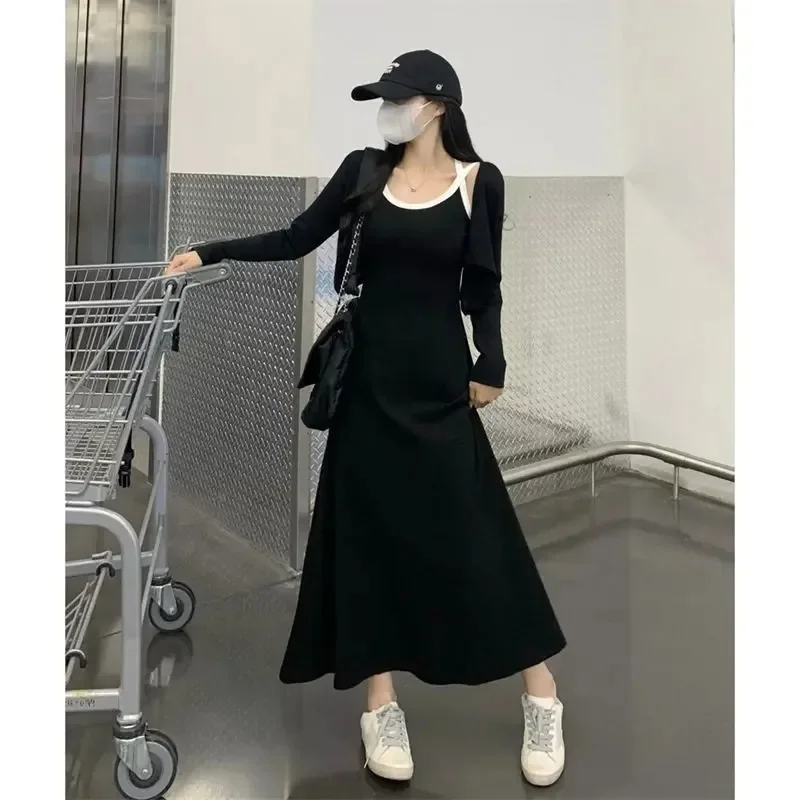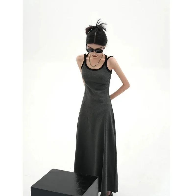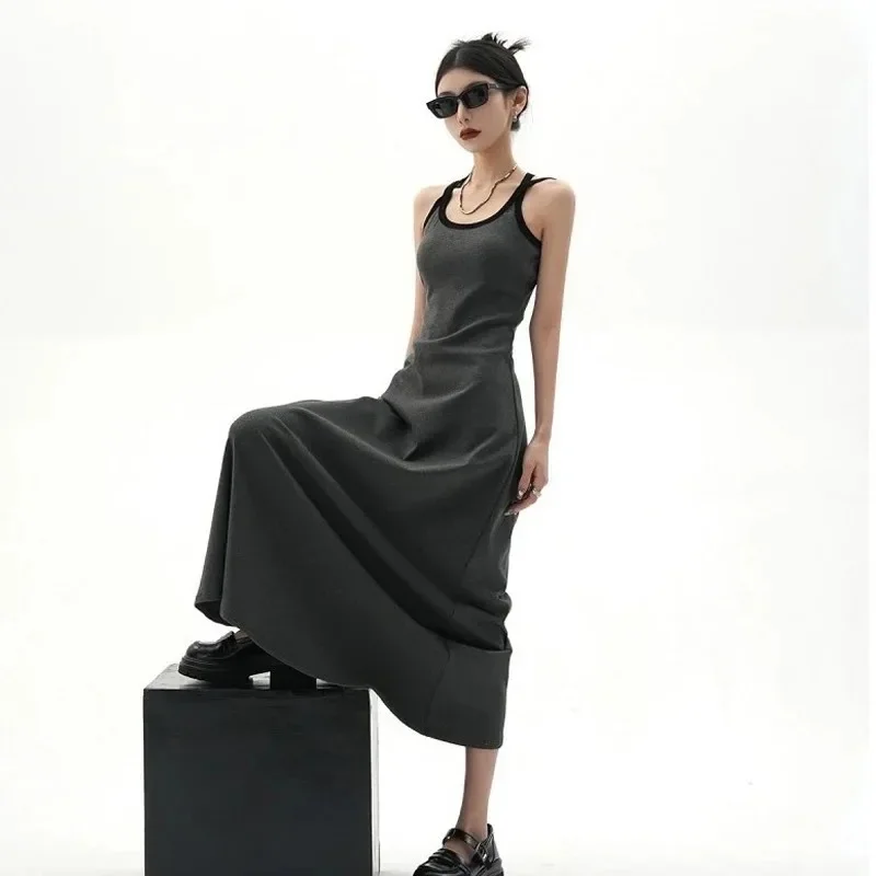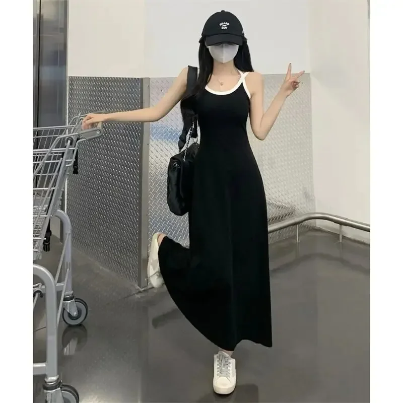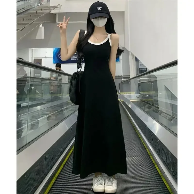 New Fashion Summer Black Loose Slip Dress Off Shoulder Solid Simplicity All-match Sleeveless Dress Temperament Women Clothing