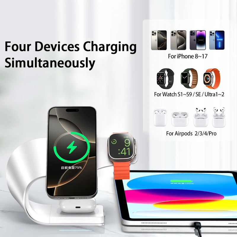 Magnetic Wireless Charger 4 in 1 Metal Shell 15W Fast Charging Station Stand for iPhone 12-17 Mobile Phones Airpods Apple Watch
