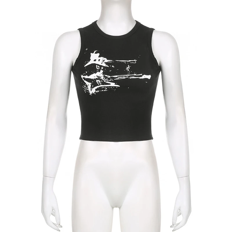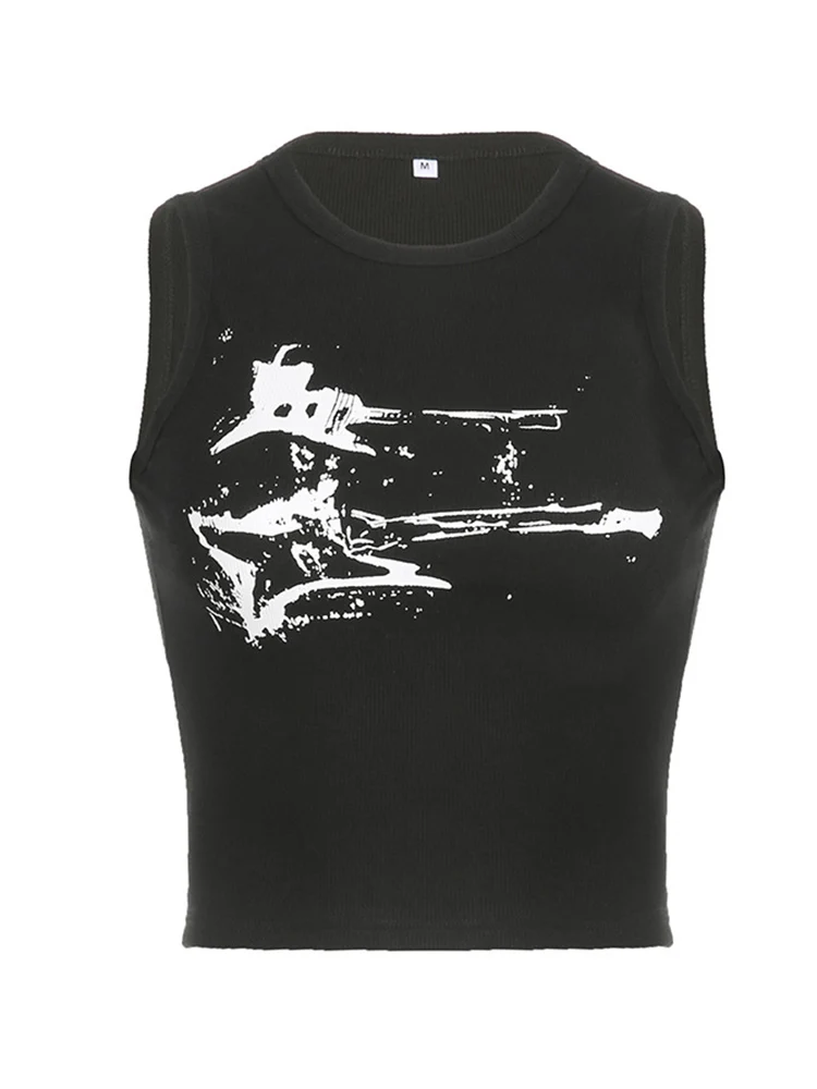 Guitar Print Sleeveless Tank Top Y2K Casual Ribbed Women Grunge Crop Top Harajuku Fashion Vest Tee 90s Street Outfits