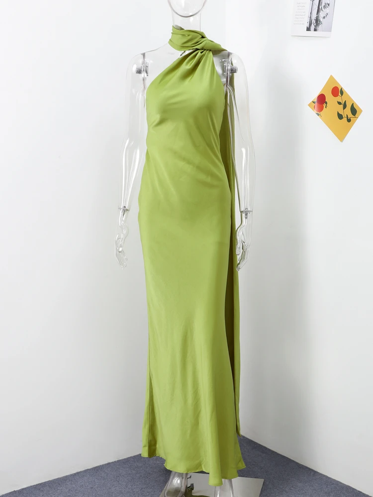 Elegant Ribbon Halter Dress Women Solid Off Shoulder Sleeveless Backless Slim Maxi Dresses 2025 Summer Autumn Party Robes Lady