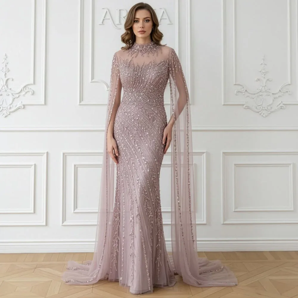 Luxury Mermaid Evening Dress with Cape Sleeves for Women 2026 Elegant High Neck Beads Formal Prom Wedding Party Gowns Customized
