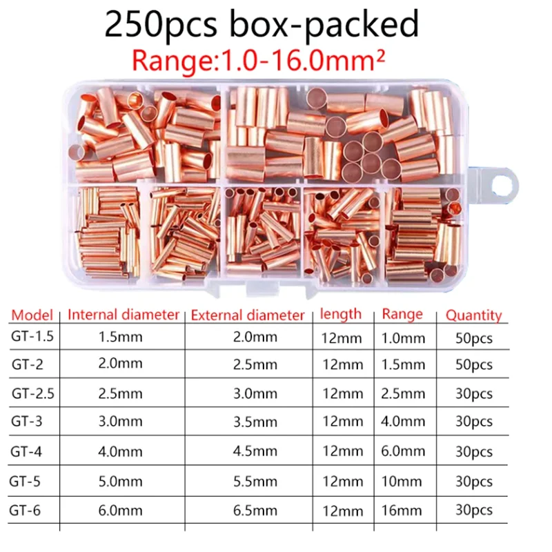 250pcs GT Copper Connecting Pipe Wire Joint Small Copper Tube Terminal Cable Lug Bootlace Ferrule Kit with Crimping Pliers