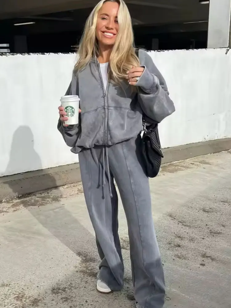 HH Women's Fall 2-Piece Retro Solid Color Zip Bomber Jacket Sweatshirt+High Waist Lace Up Women's Wide Leg Pants Street Wear