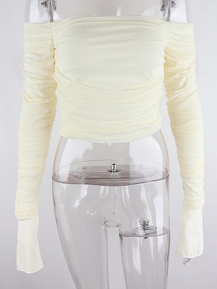 Mesh Patchwork Women Long Sleeve Crop T Shirt Ruched Off Shoulder Bodycon Elegant Streetwear 2023 Spring Summer