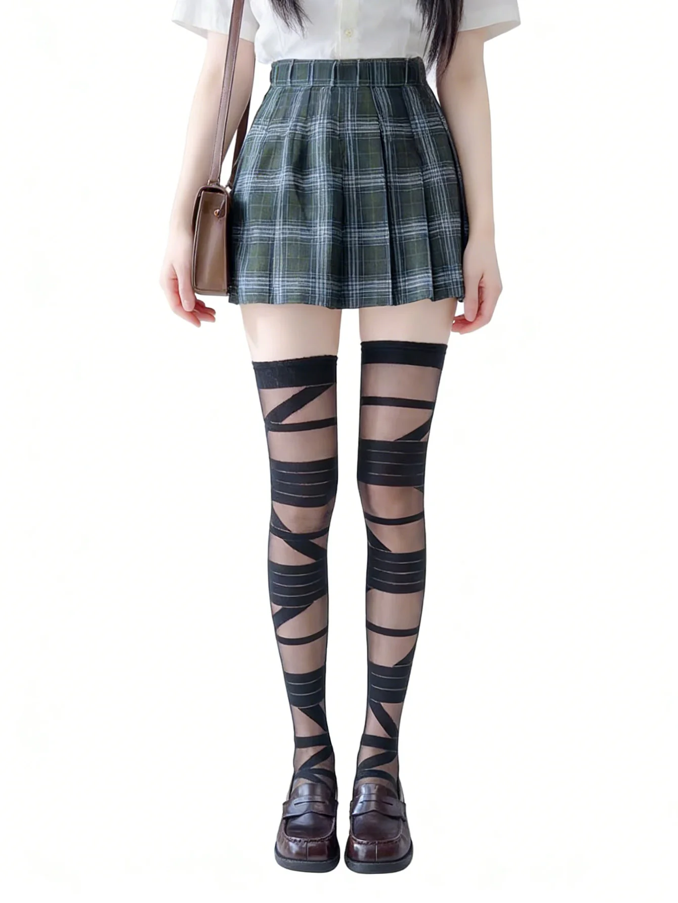 Women's Black Irregular Bandage Design Sheer Over-the-Knee Socks, E-Girl Style High-Stretch Slimming Hosiery,Versatile for Daily