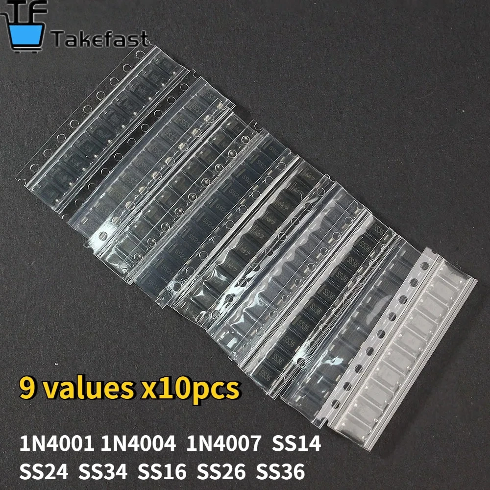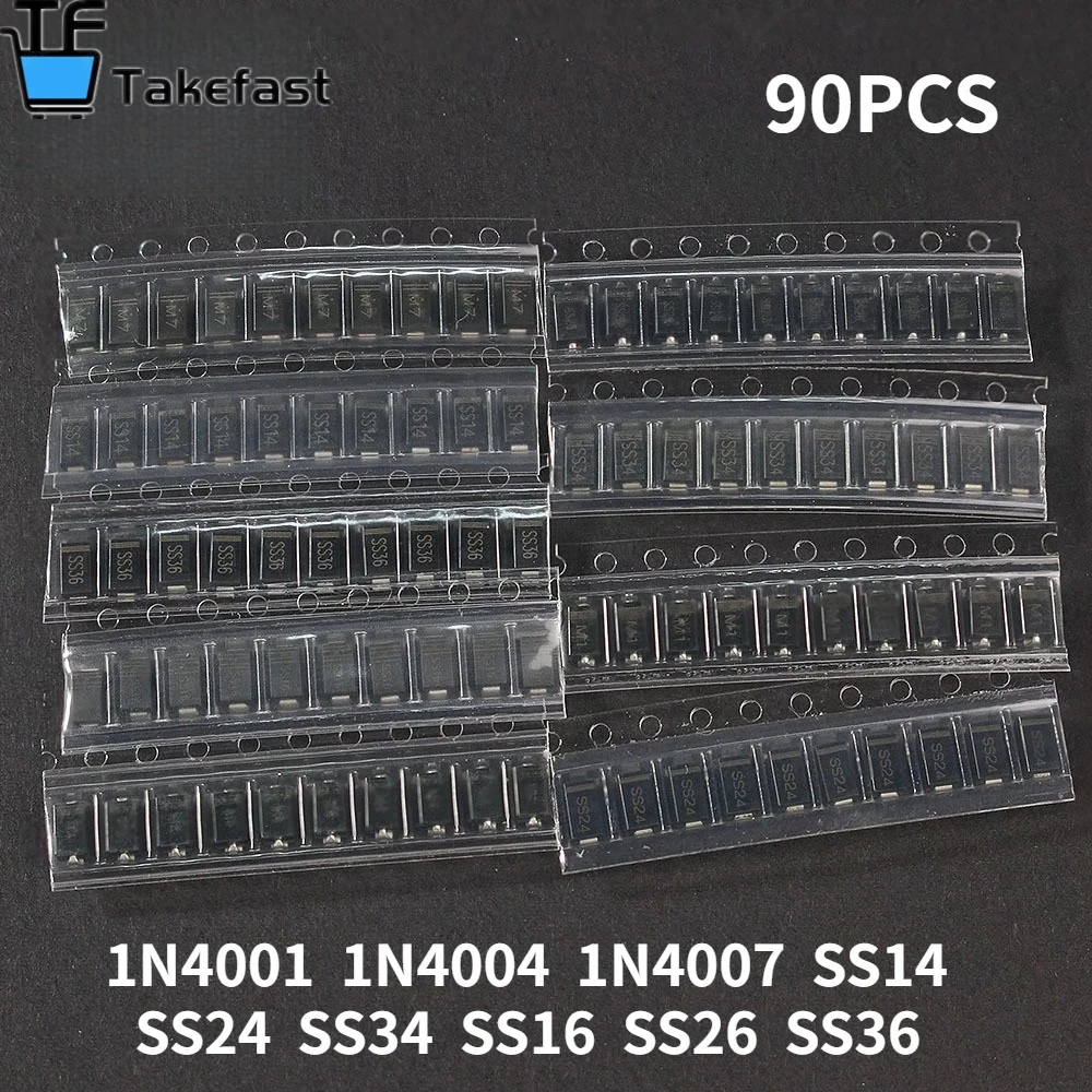 Takefast 90pcs SMD Diode Kit 1N4007 1N4001 1N4004 SS14 SS16 SS24 SS26 SS34 SS36 9 Values X10pcs Rectifier Diodes Schottky