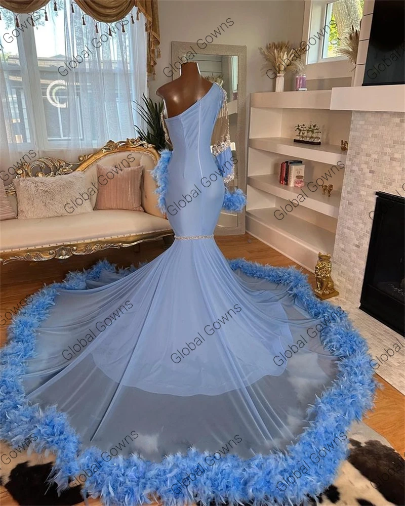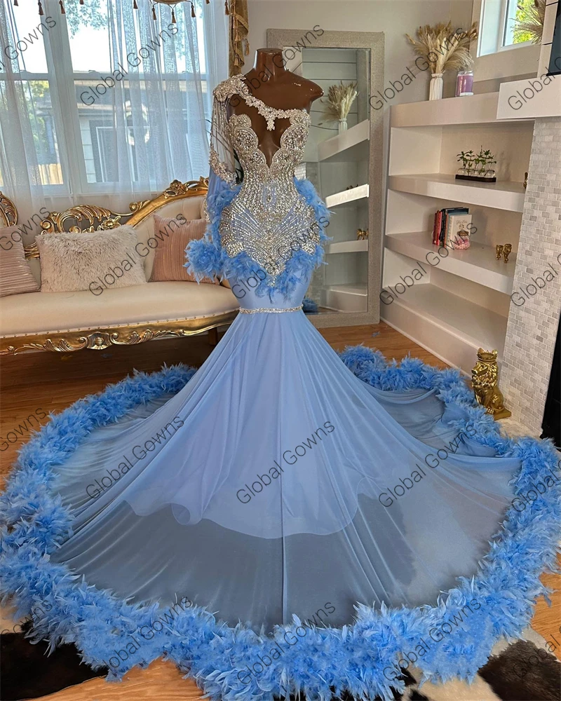 Silver Bead Diamonds Blue Evening Dresses One Sleeve Feathers Glitter Crystal Prom Dress Mermaid Birthday Party Gowns Customized