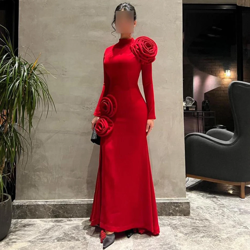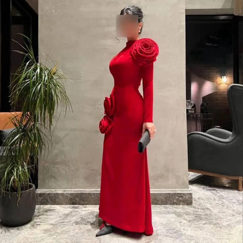 Flechazo Red 3D Flower Evening Dress O-Neck Straight Floor Length Women Long Sleeves Formal Party Gowns Guest Customized