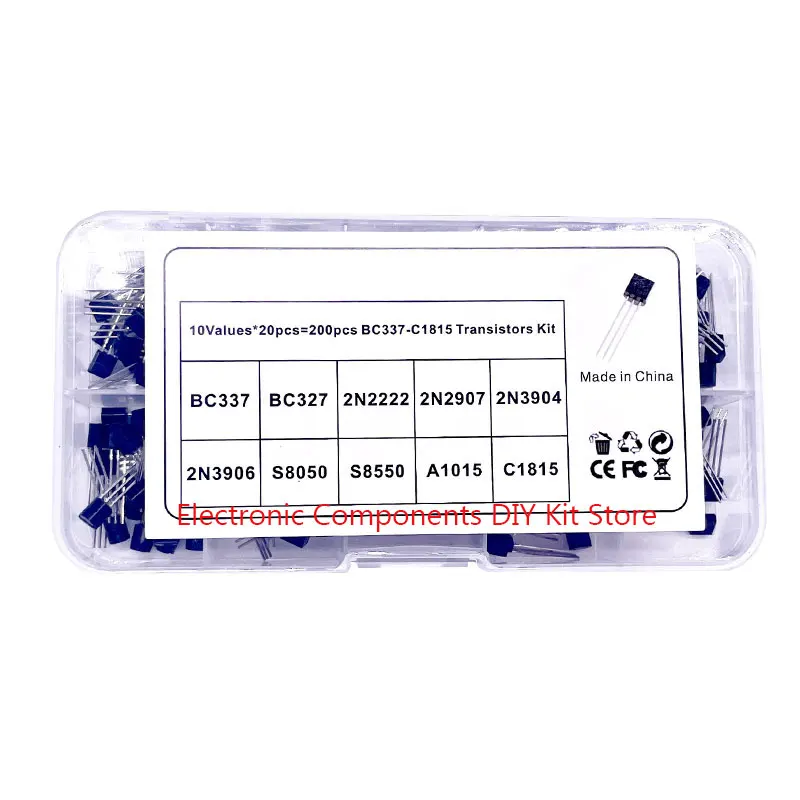 200Pcs Transistor Kit BC327 BC337 2N2222 2N2907 2N3904 2N3906 S8050 S8550 A1015 C1815 PNP/NPN 10 Values TO-92 Transistors Set