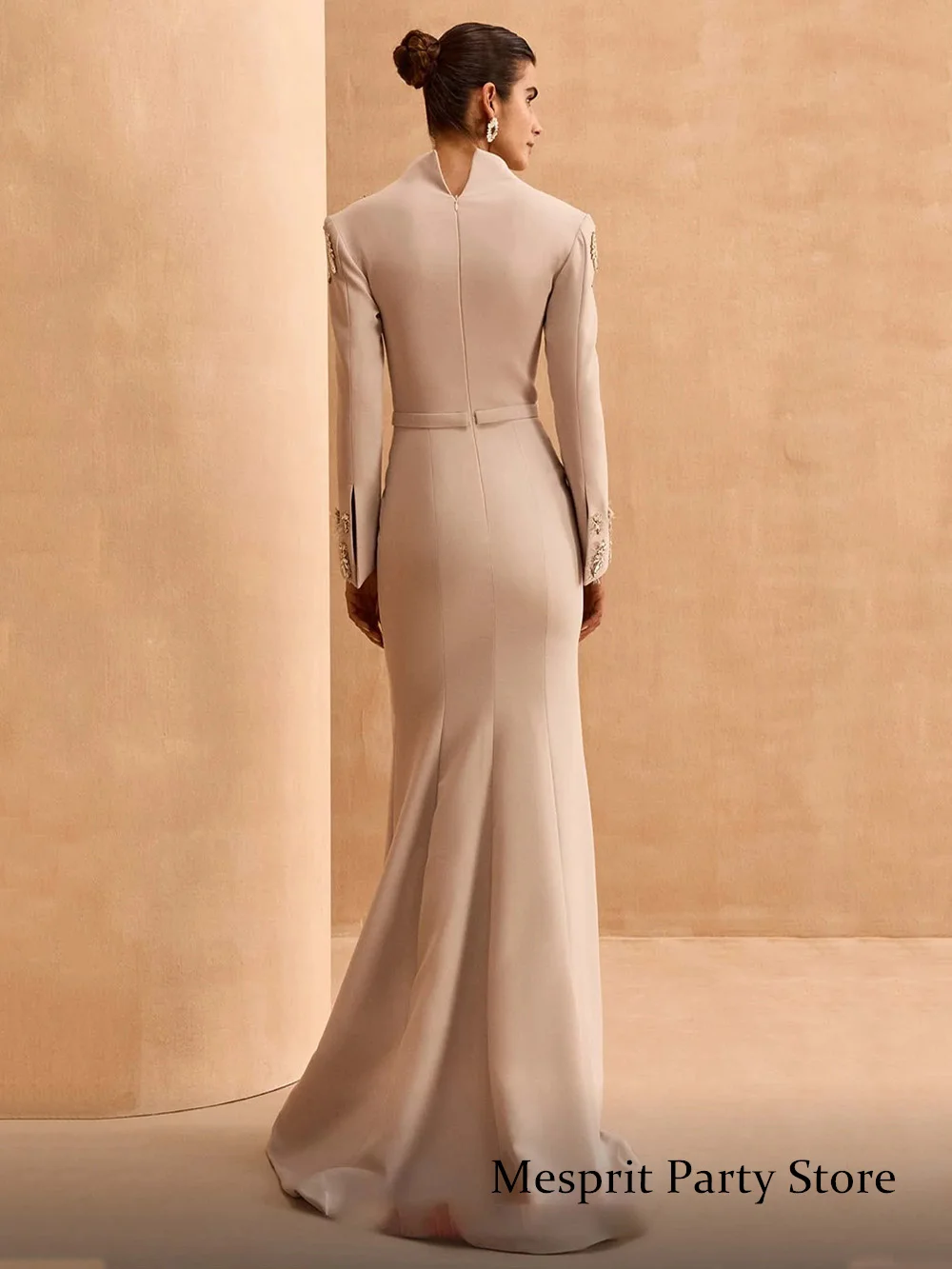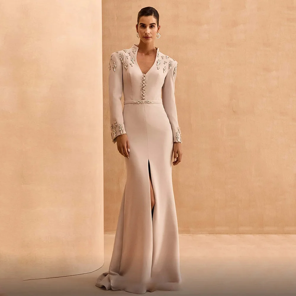 Saud Arab Evening Dress for Woman Customized Long Sleeves V Neck Crystal Buttons Front Slit Mermaid Prom Gown فساتين سهرة