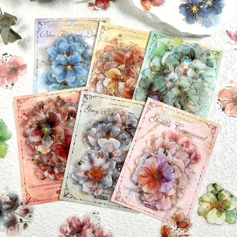 20pcs/pack Hot stamping flower stickers PET Materials Collage Junk Journal DIY Scrapbooking Supplies Aesthetics Decor Sticker